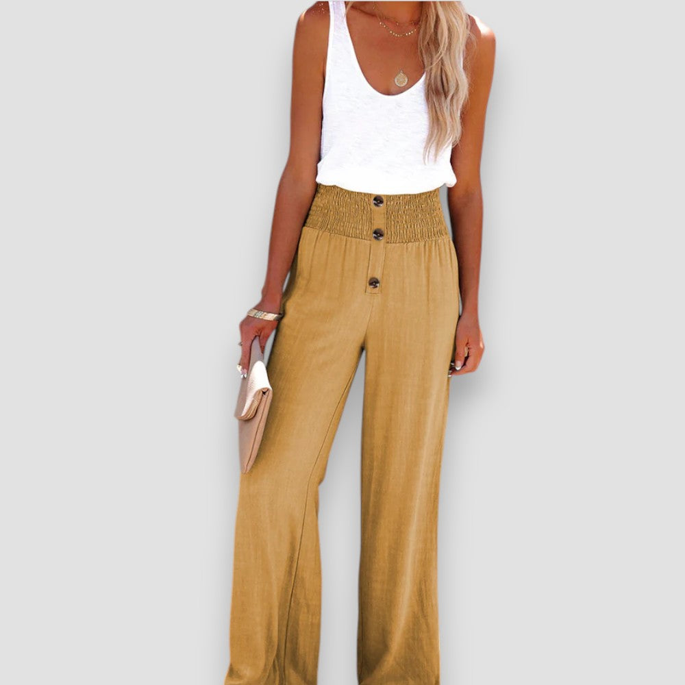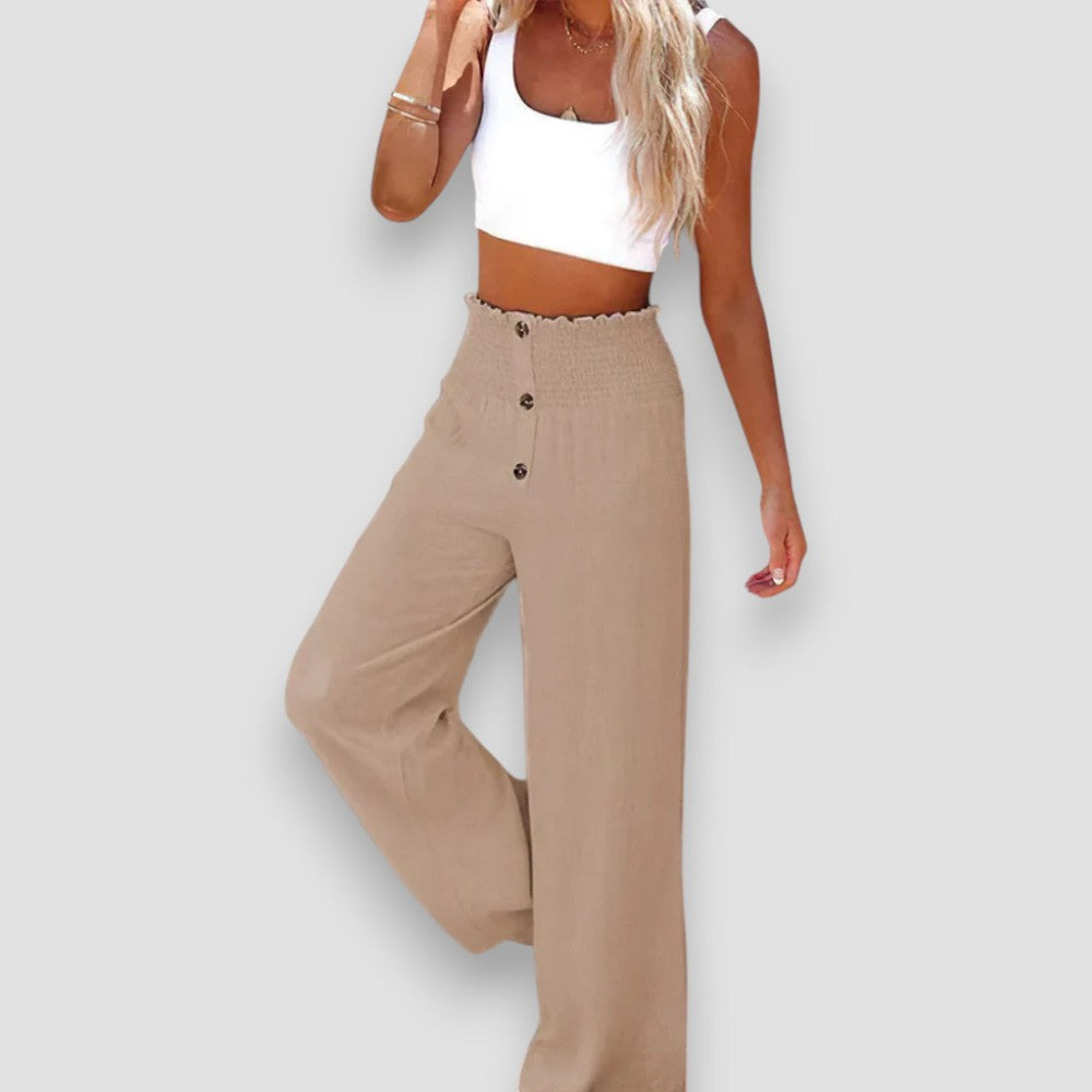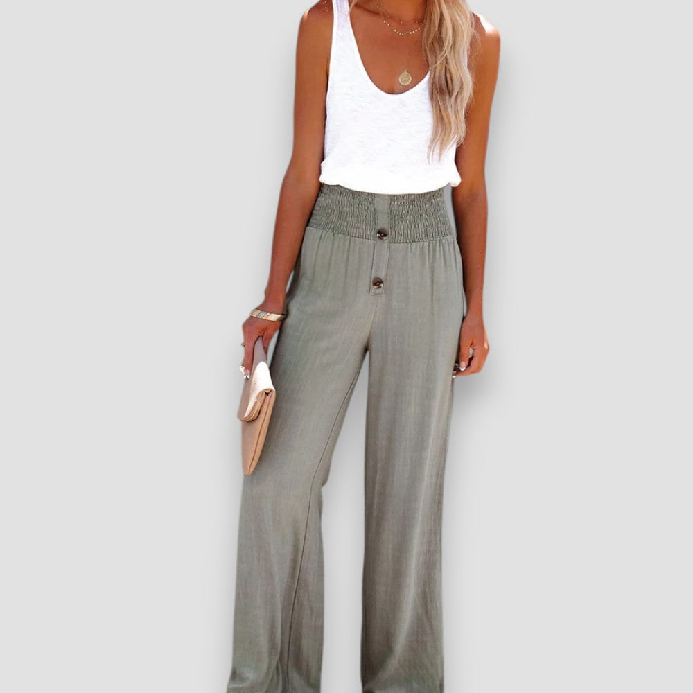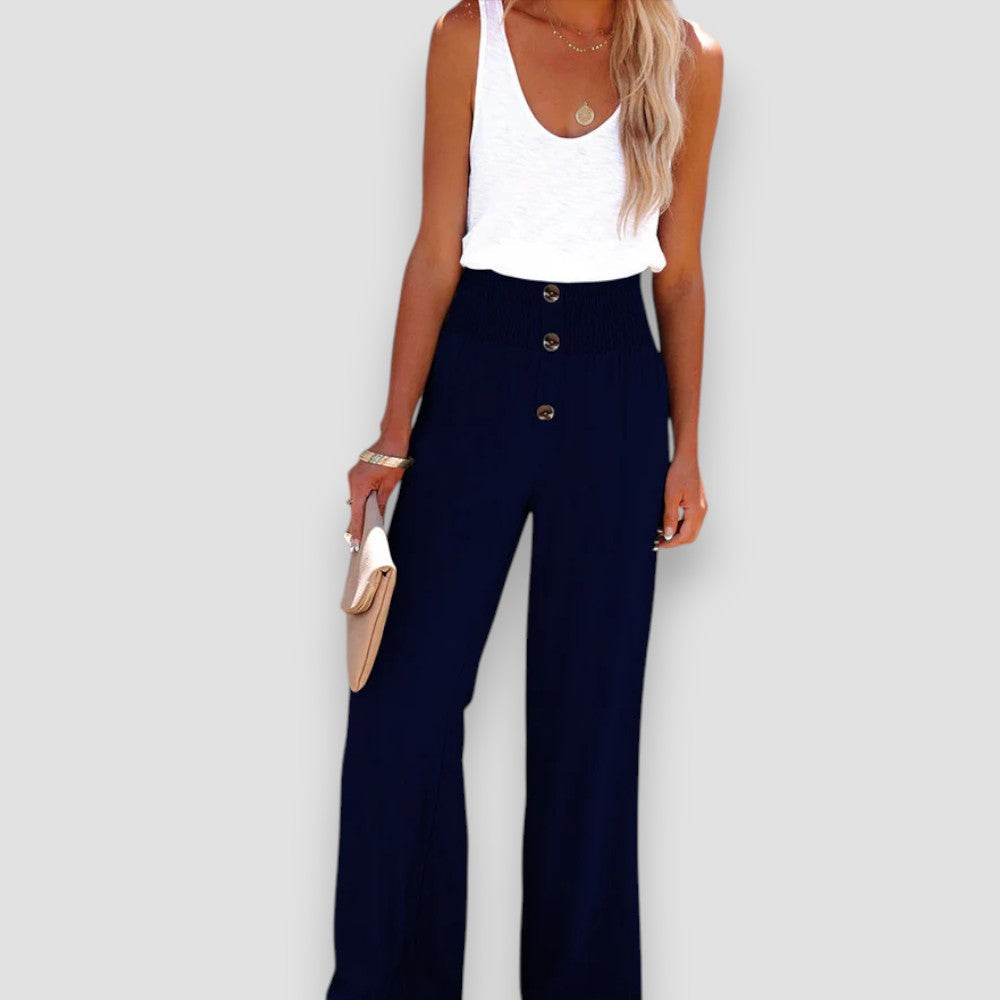 Il pantalone Alessia con vita alta unisce perfettamente comfort ed eleganza. La vestibilità rilassata e la vita alta creano una silhouette snella, mentre le gambe larghe offrono un aspetto moderno e leggero.