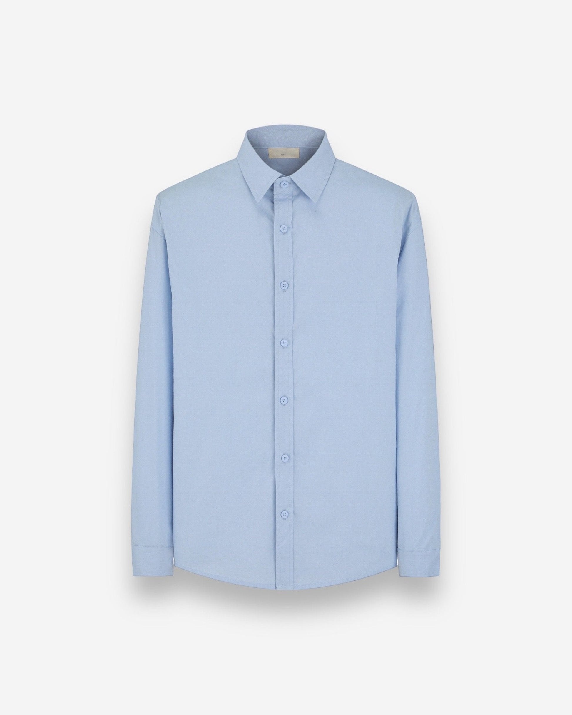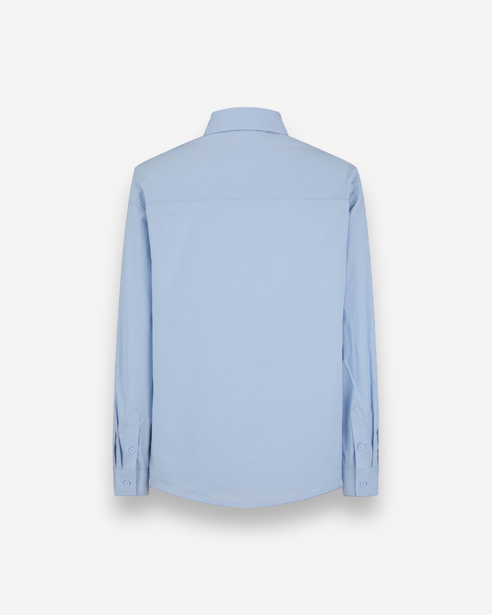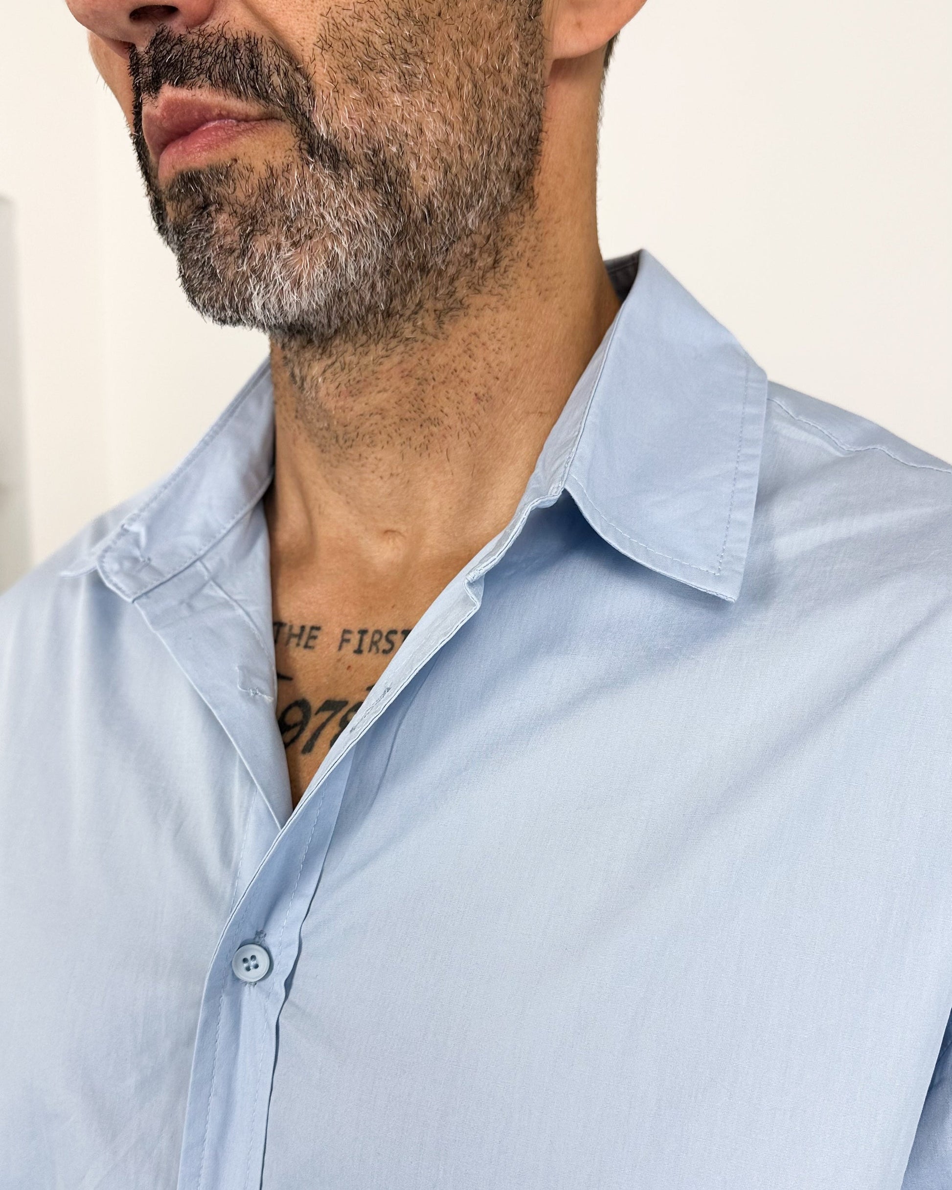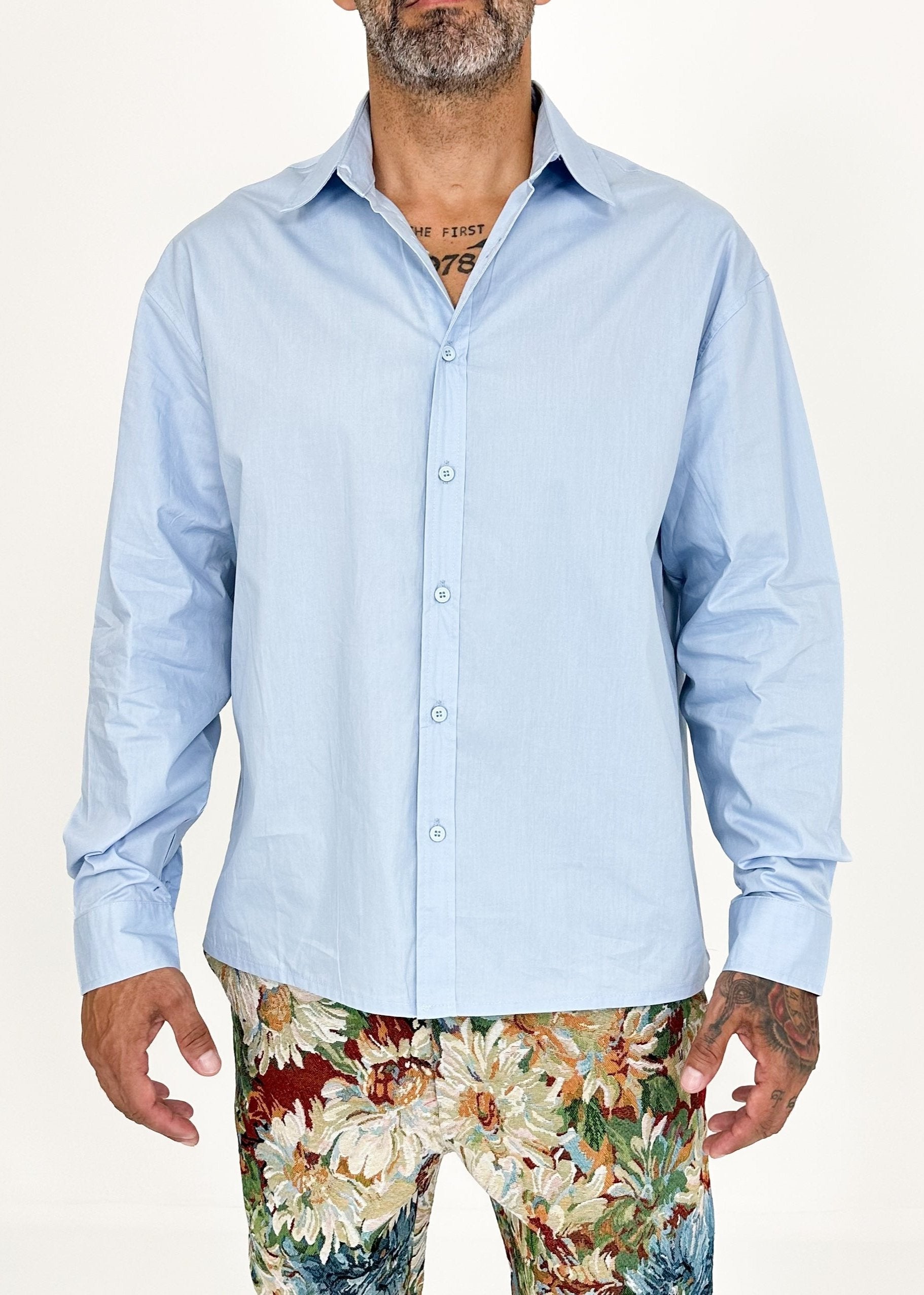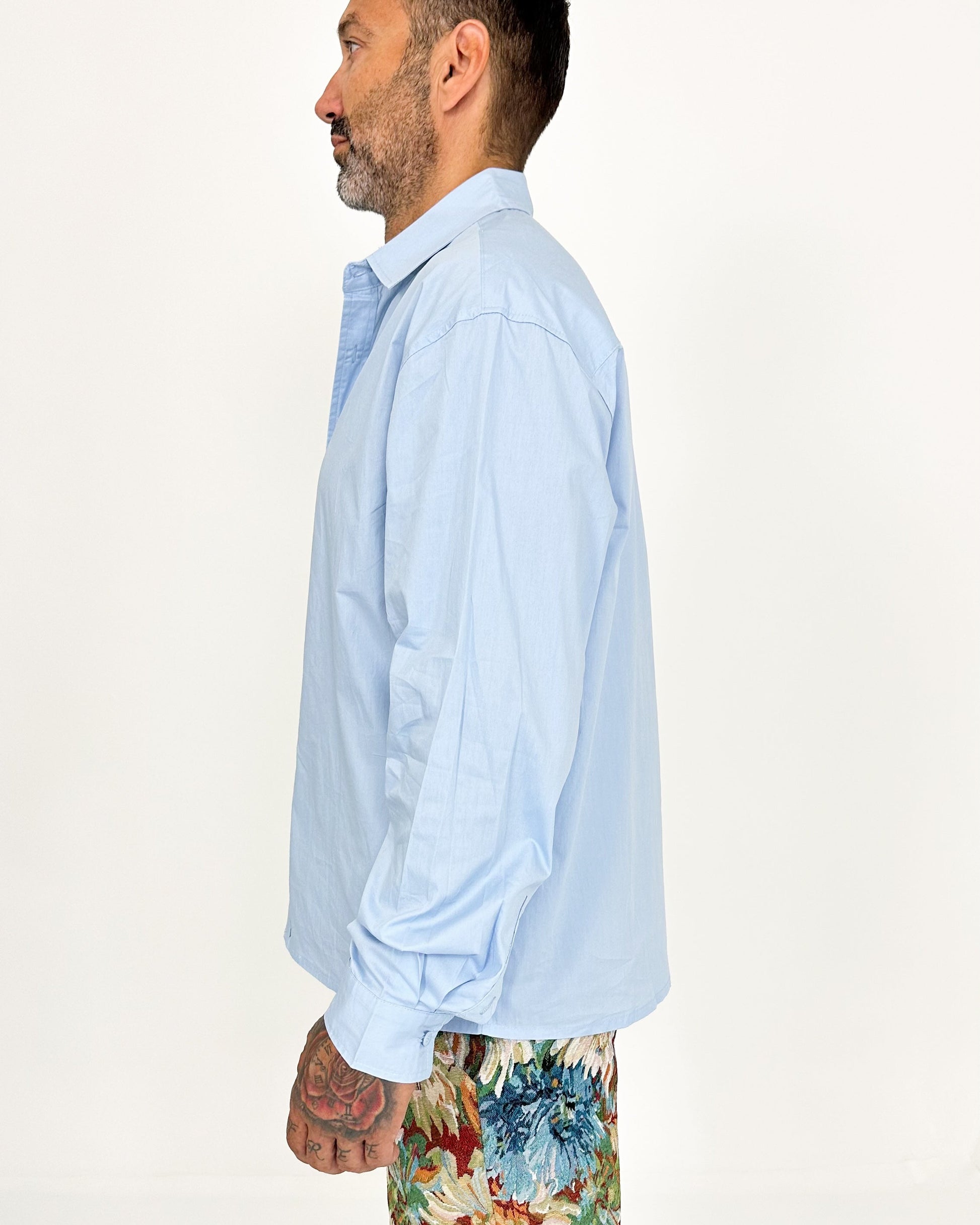 Camicia modello oversize in cotone celeste. Chiusura frontale e bottone sul polsino.