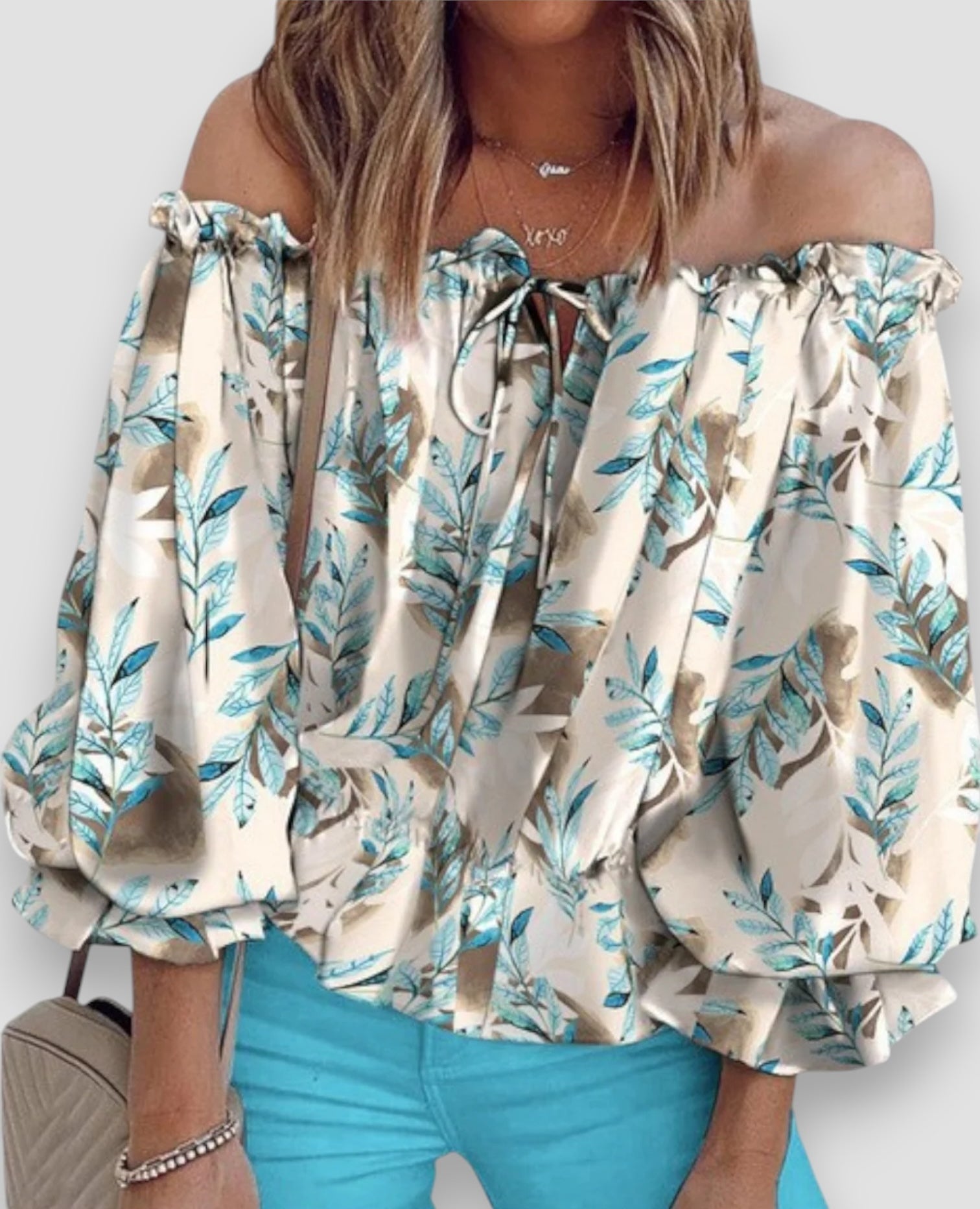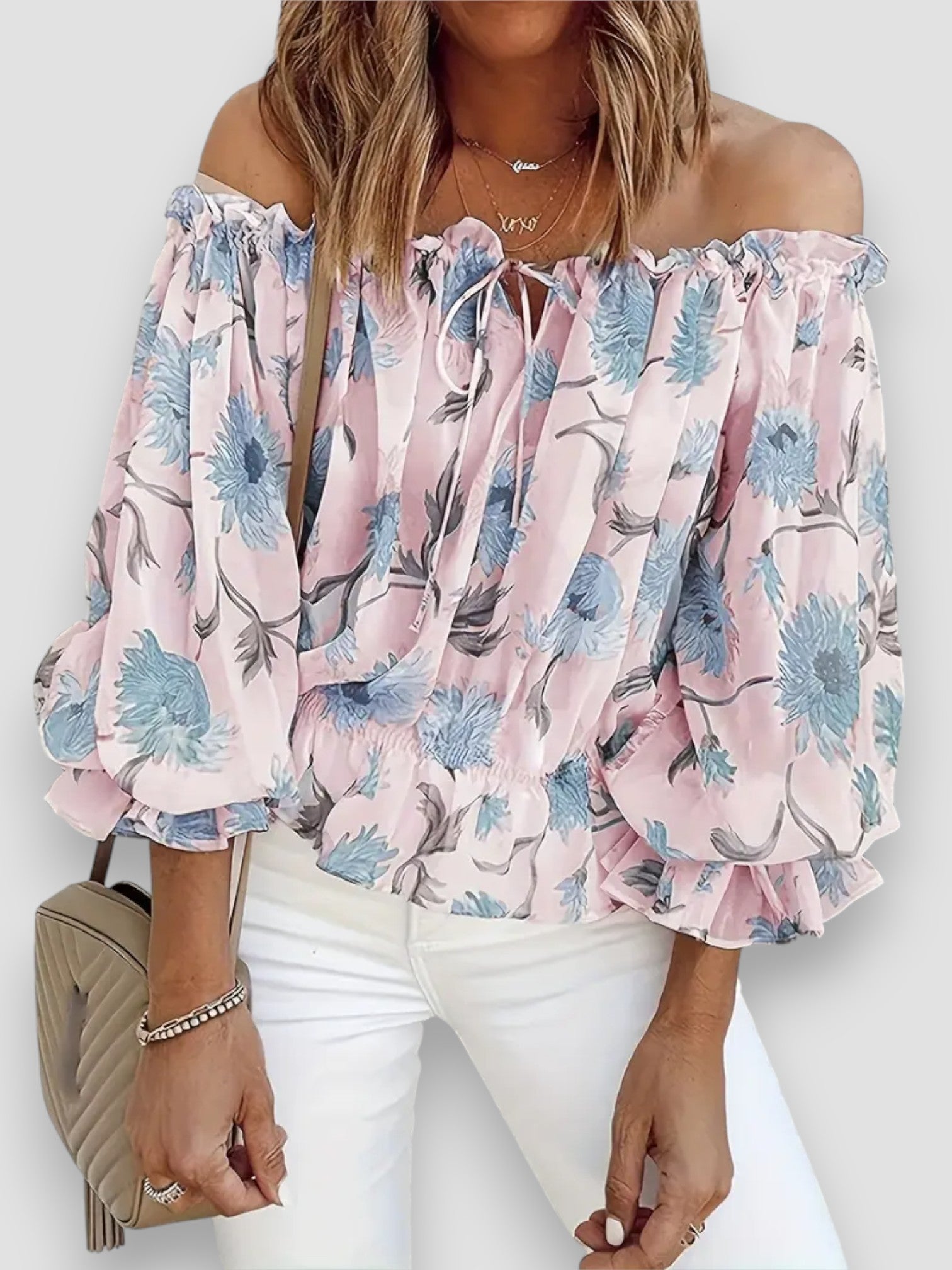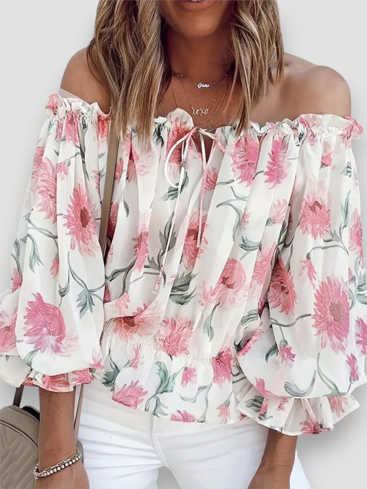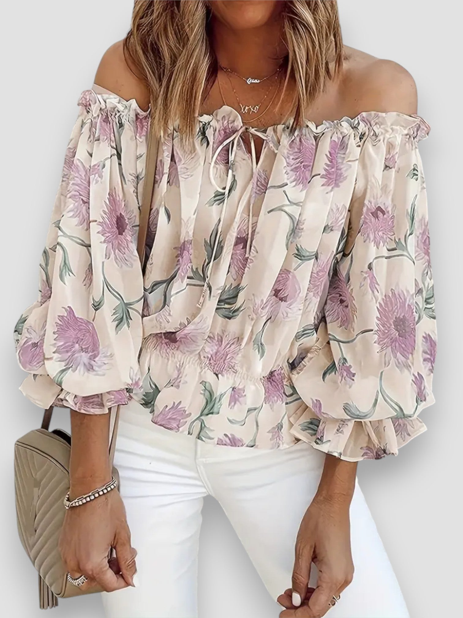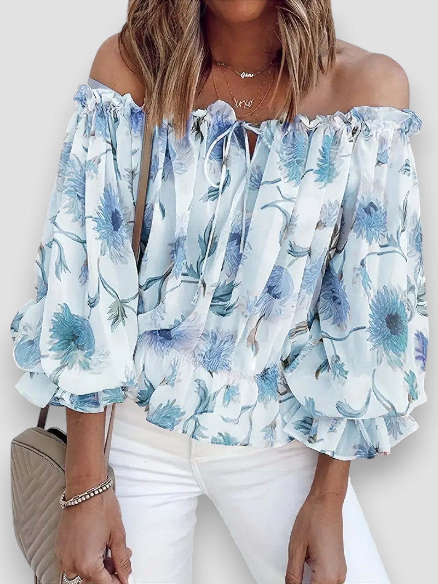 Questa raffinata blusa off-shoulder unisce una romantica stampa floreale a una vestibilità fluida e confortevole. Il tessuto in chiffon è leggero sulla pelle, mentre le maniche a lanterna plissettate aggiungono un tocco sofisticato. Perfetta per un look chic senza sforzo!