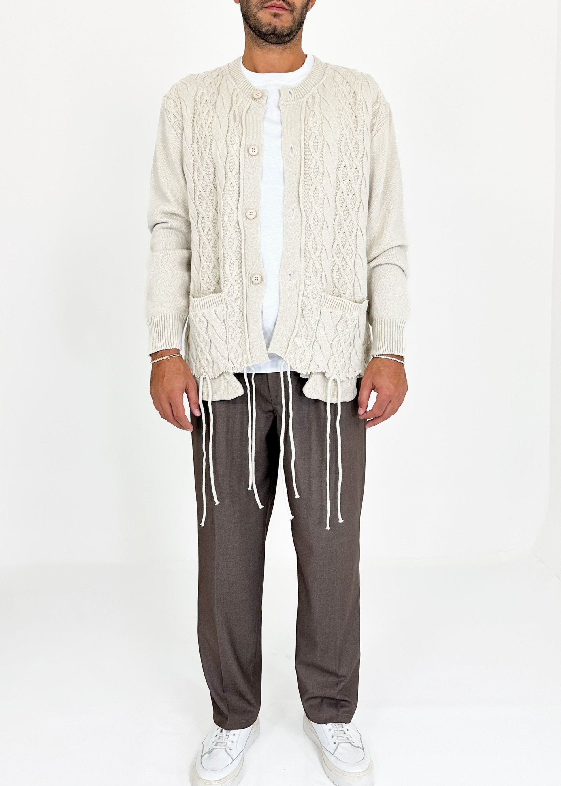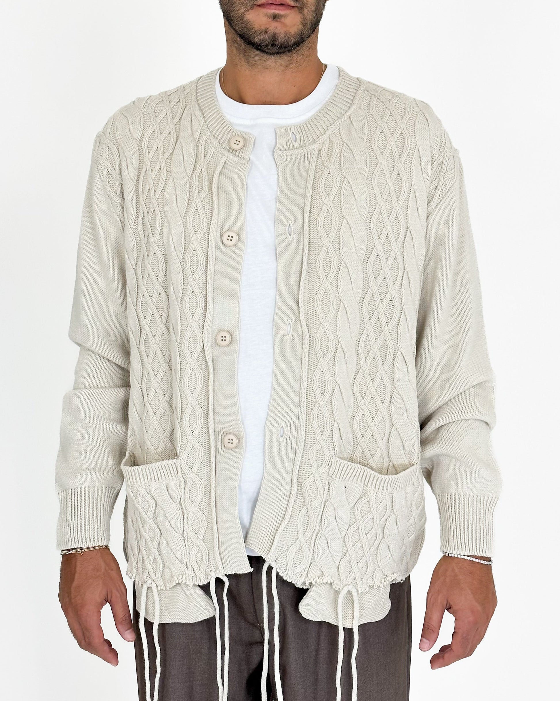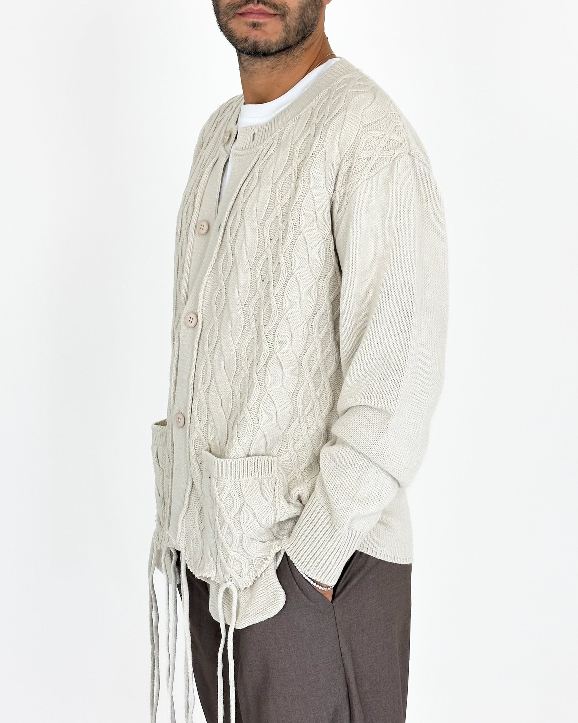 Cardigan oversize fit con fantasia a trecce frontale, scollo rotondo e maniche lunghe con polsini. Chiusura frontale con bottoni tono su tono, tasche applicate.