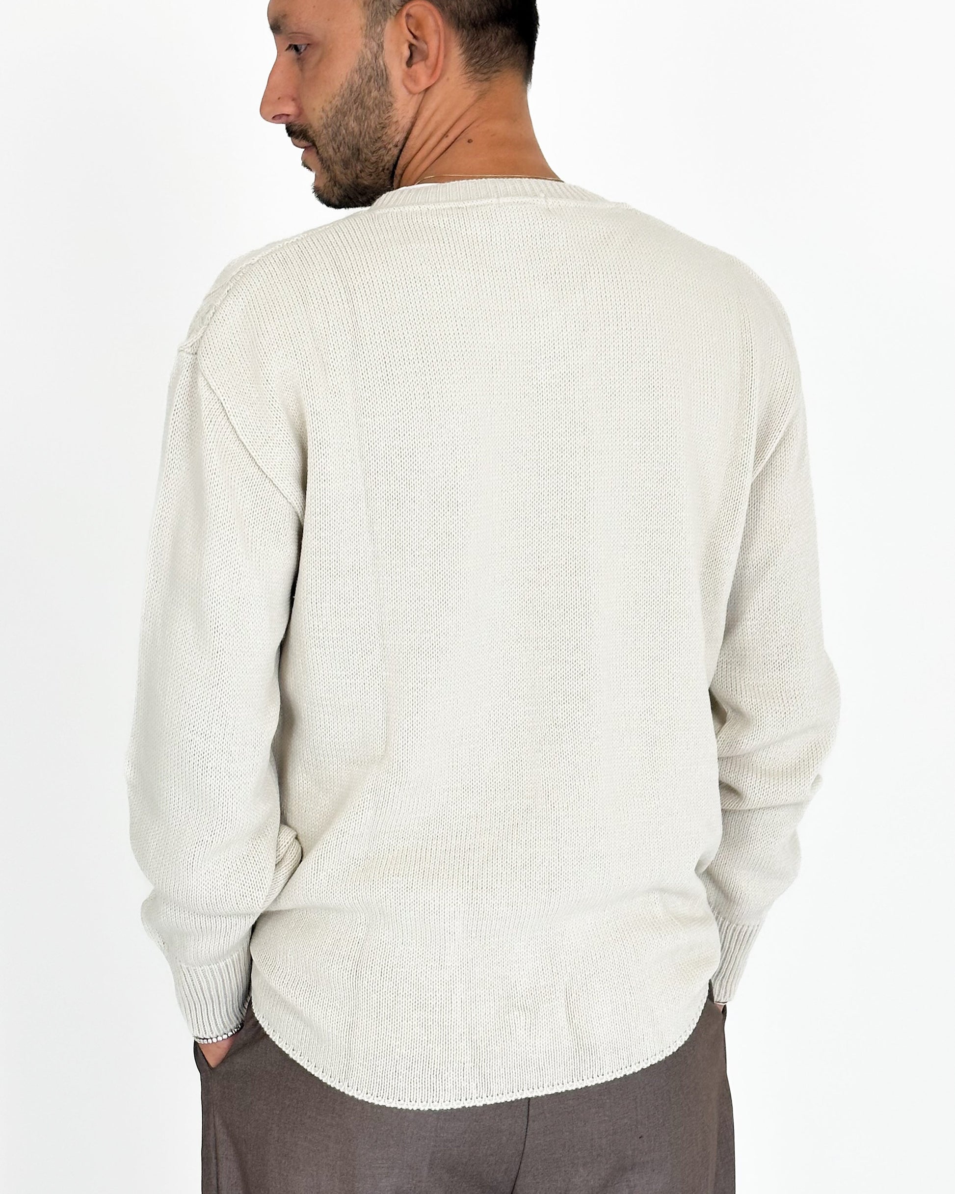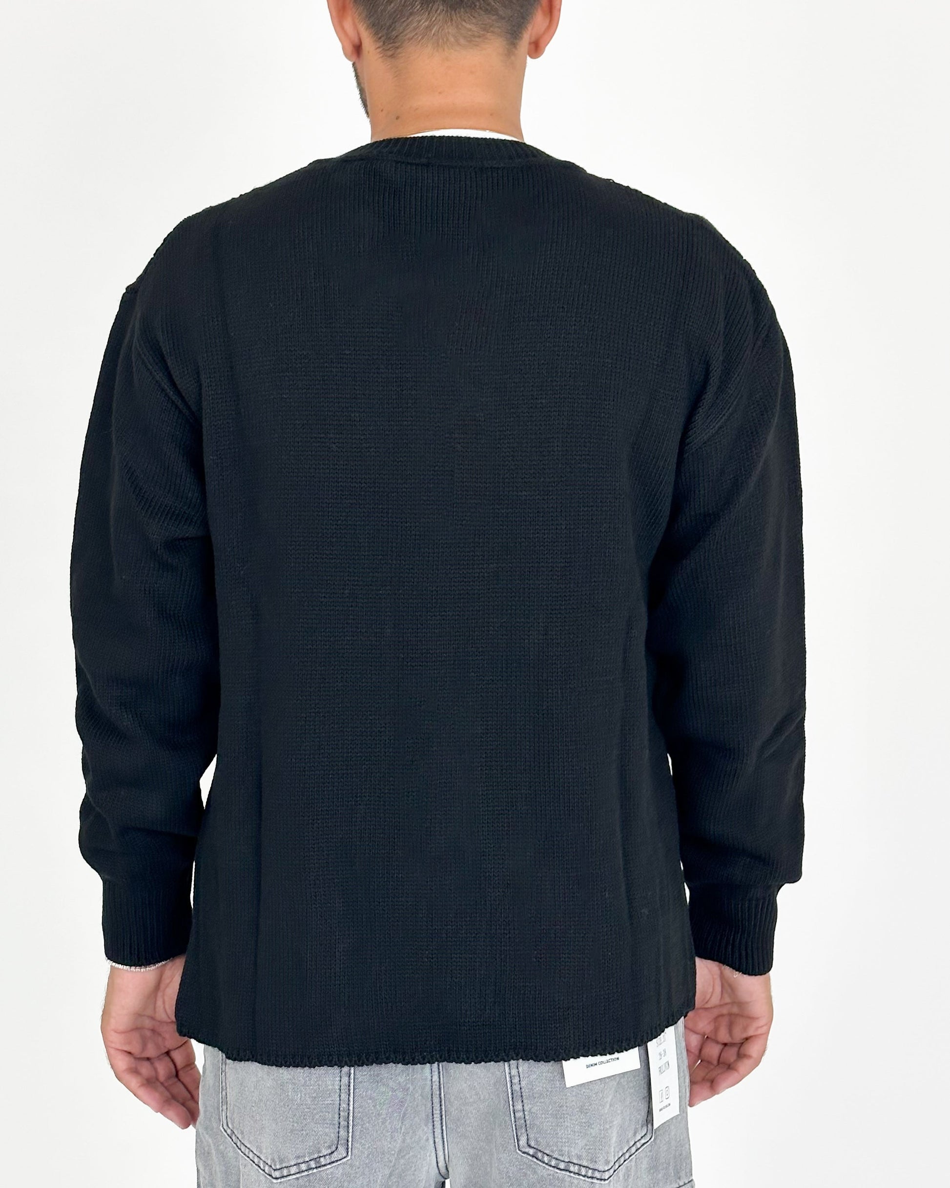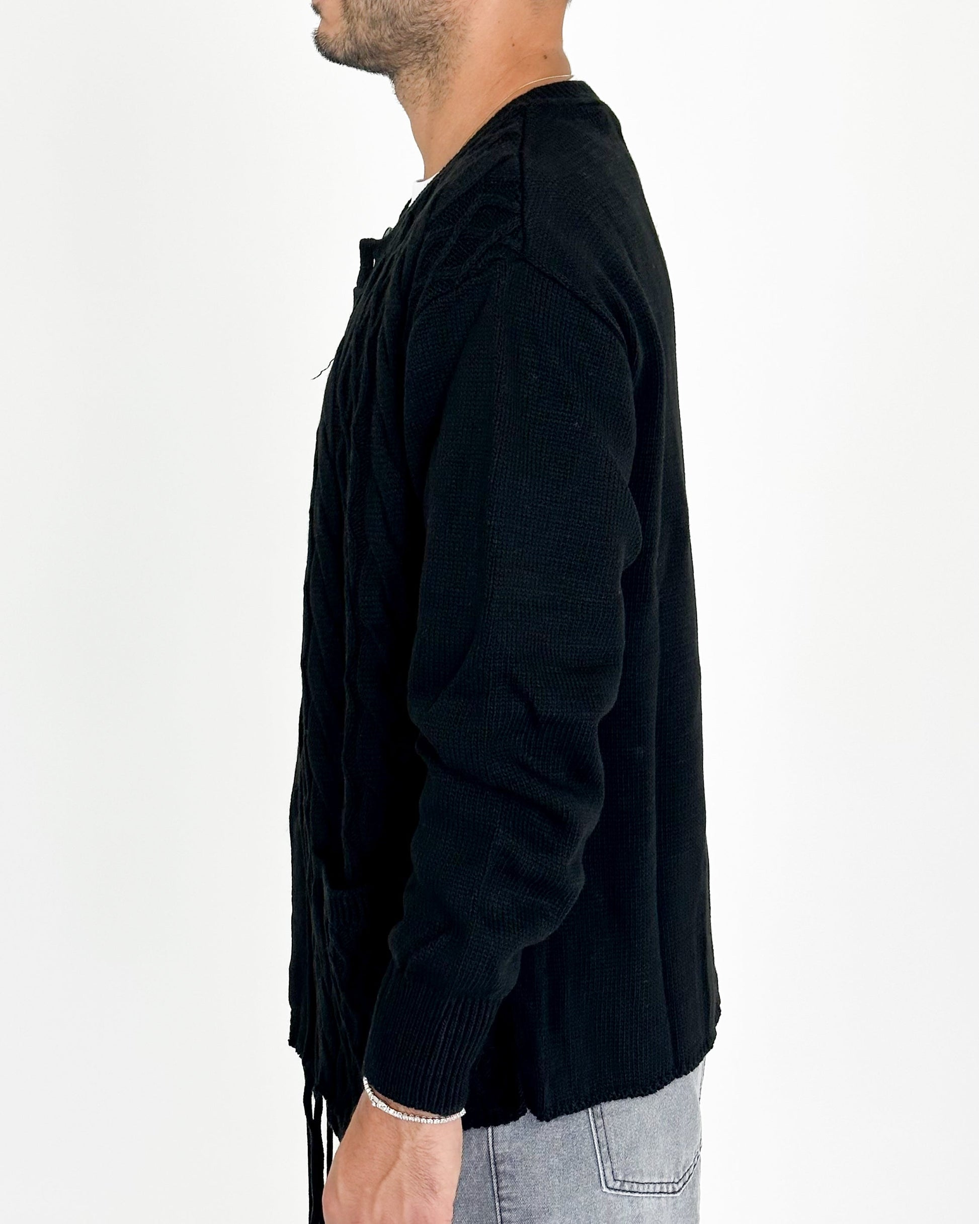 Cardigan oversize fit con fantasia a trecce frontale, scollo rotondo e maniche lunghe con polsini. Chiusura frontale con bottoni tono su tono, tasche applicate.