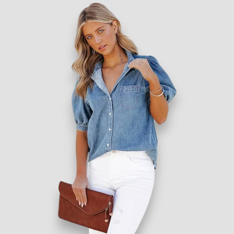 La blusa Elena offre un look denim elegante, senza rinunciare a comfort e stile. La sua finitura unica in denim look aggiunge un aspetto sofisticato, mentre il taglio versatile la rende perfetta per ogni occasione informale.