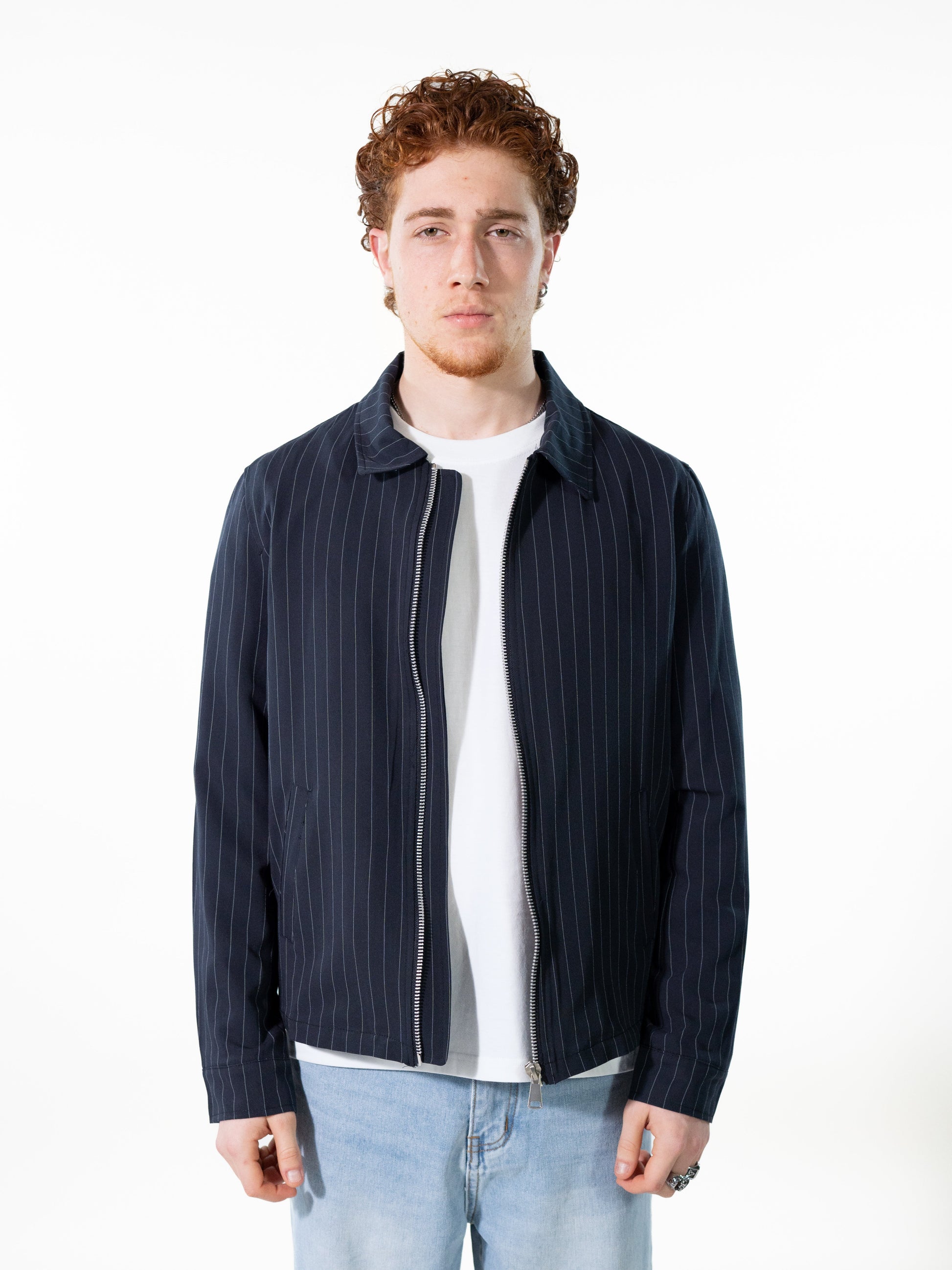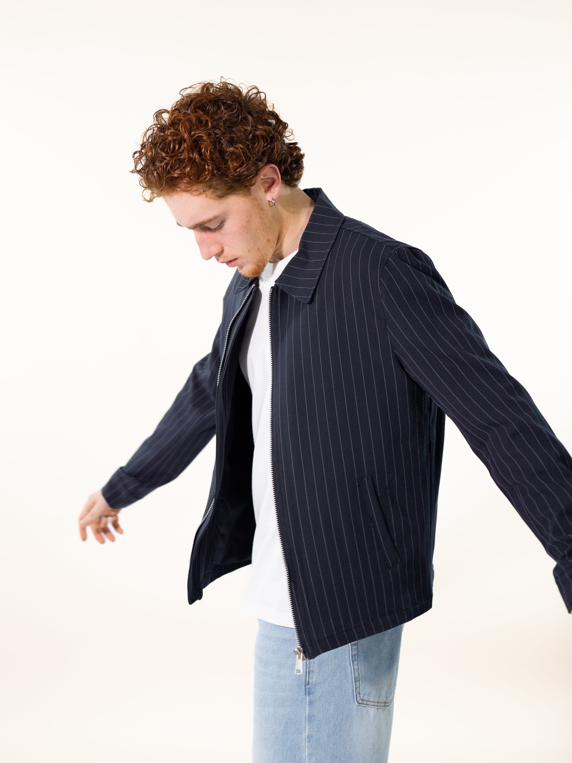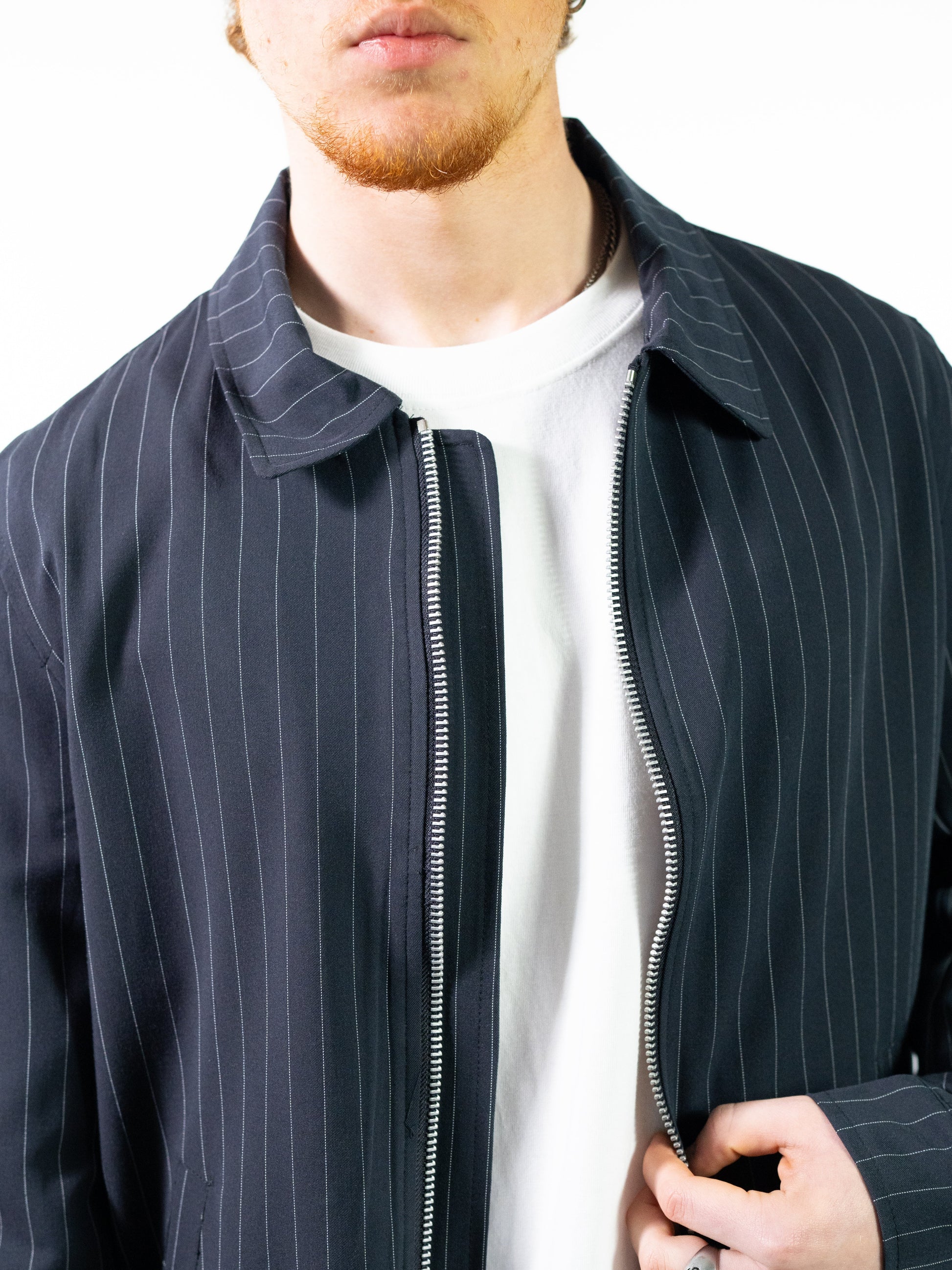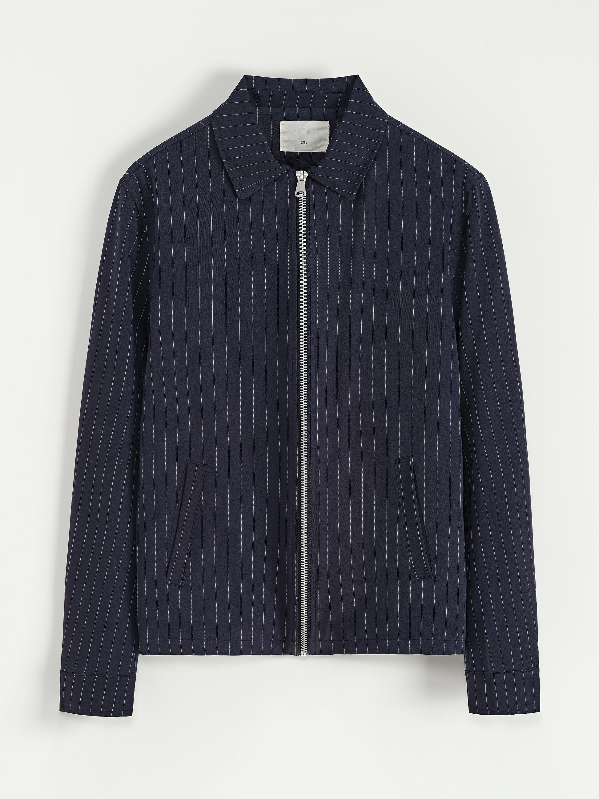 Giacca dal taglio corto in tessuto blu notte gessata. Chiusura con zip, colletto classico e tasche laterali. Perfetta per un look elegante ma contemporaneo.
