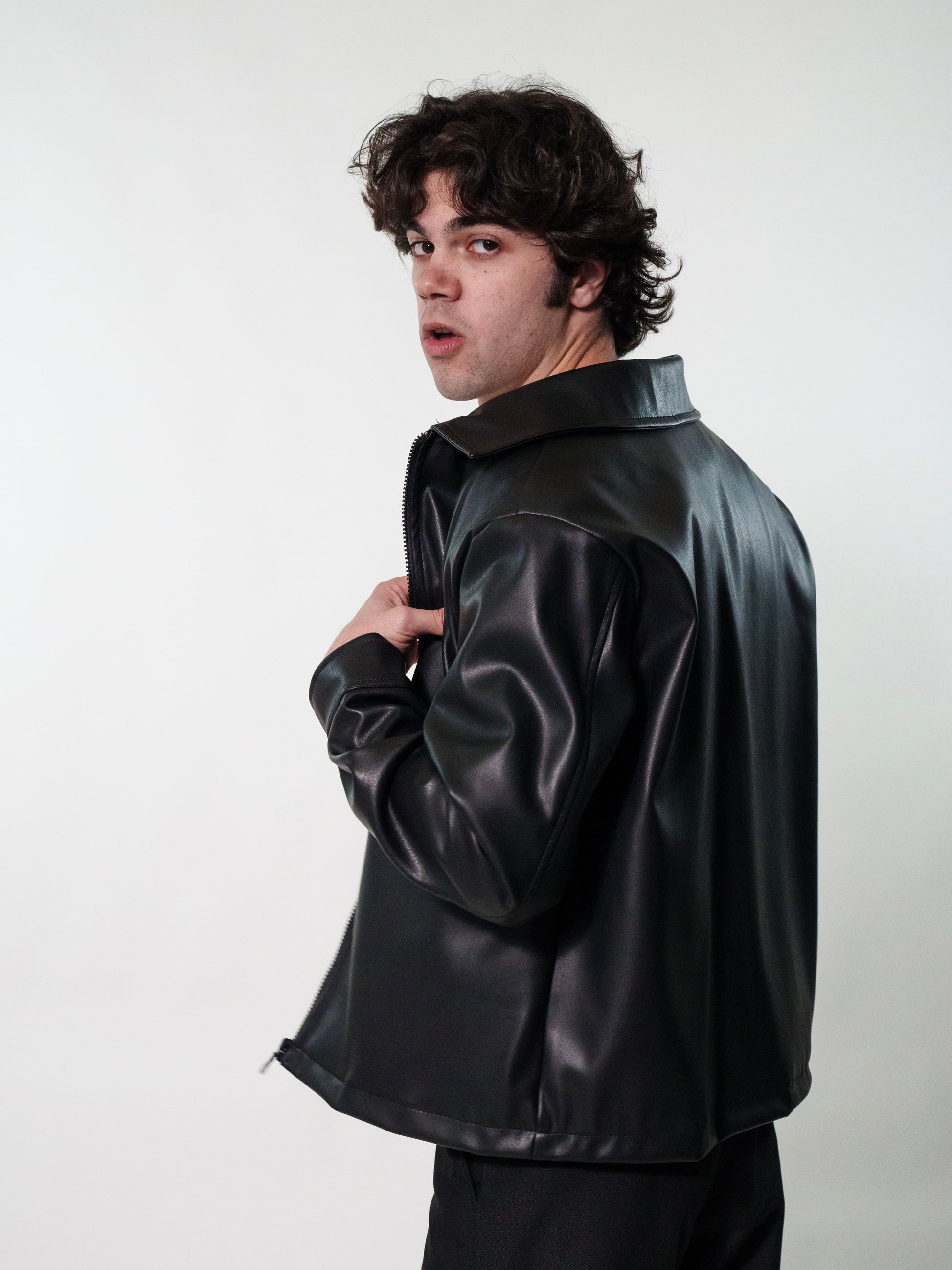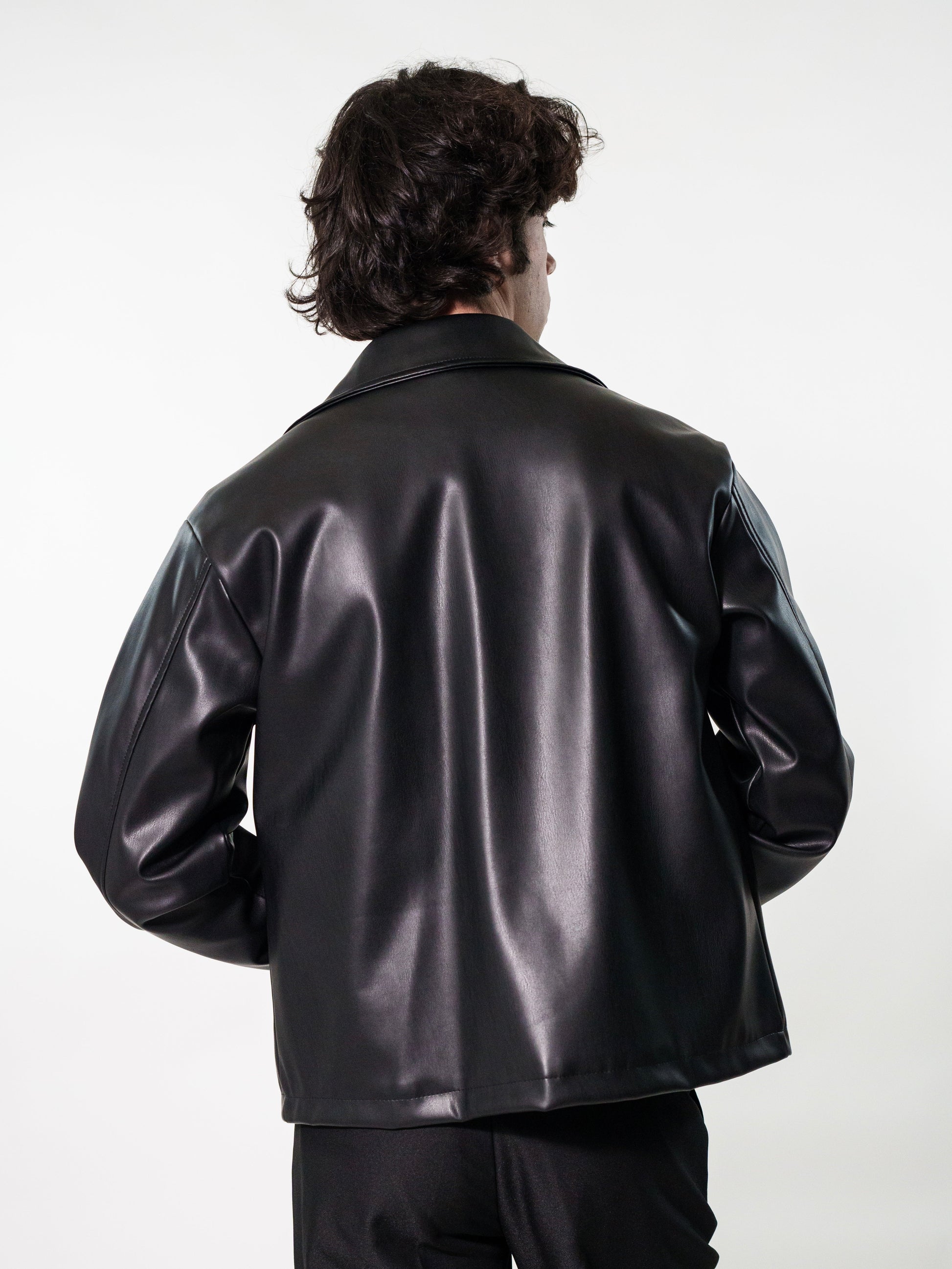 Giacca in ecopelle nera con vestibilità crop per un look moderno e raffinato. Il design minimal è arricchito da due tasche frontali e una chiusura con zip. Perfetta da abbinare a pantaloni sartoriali o denim per un outfit casual chic.
