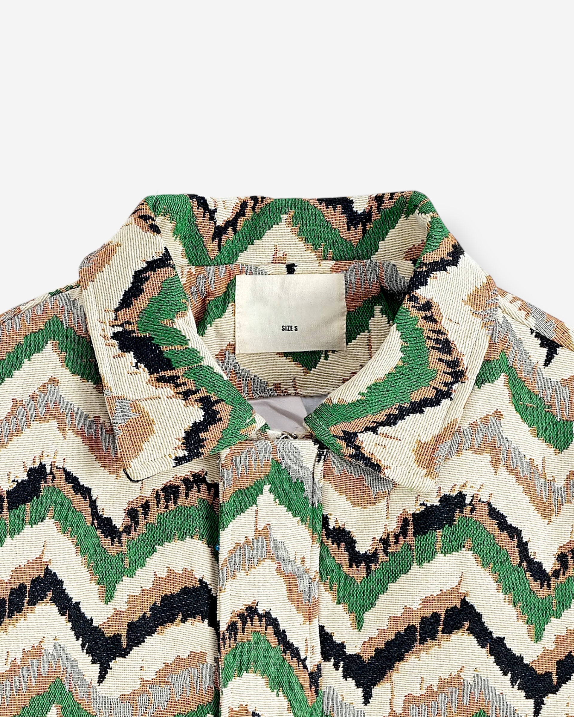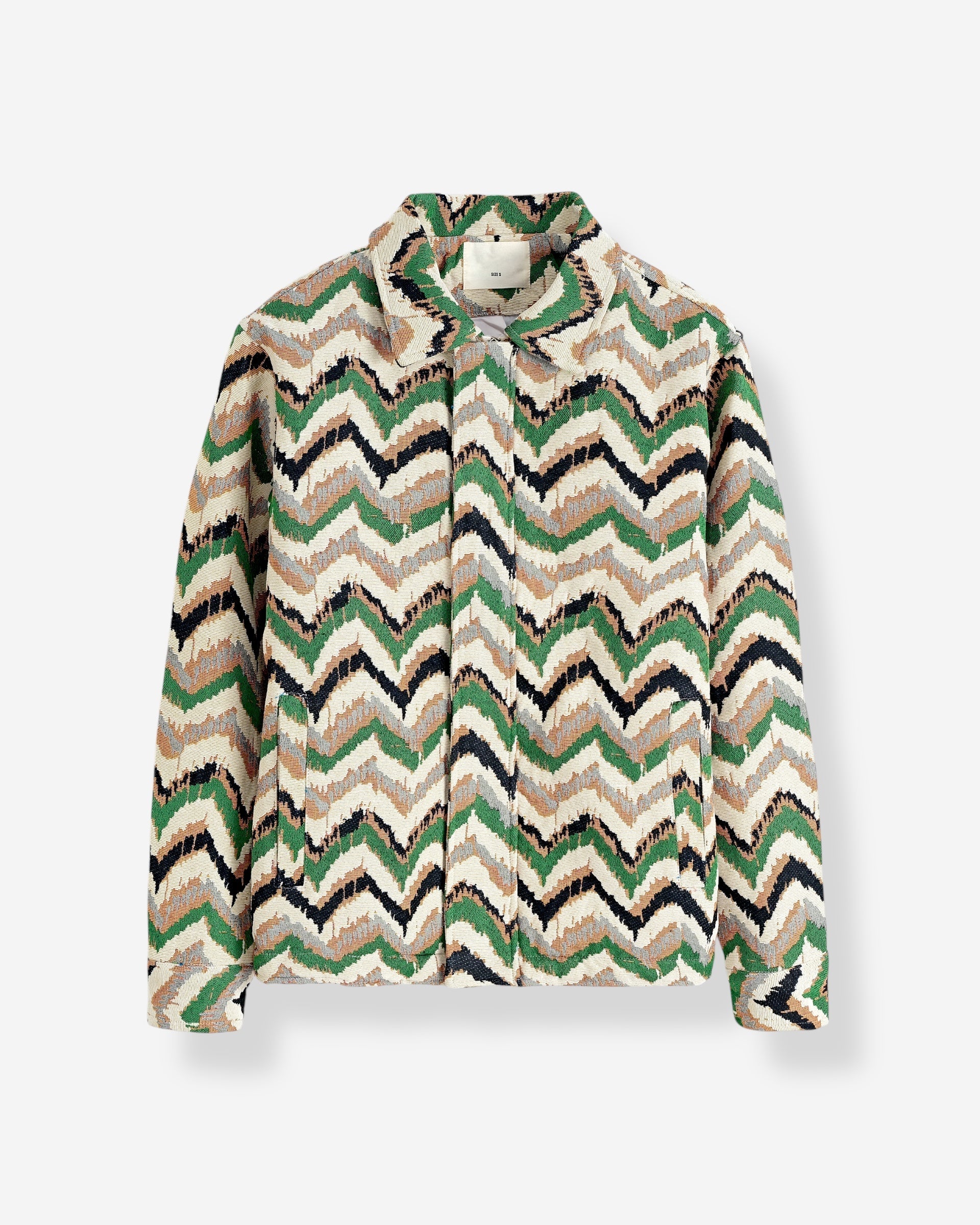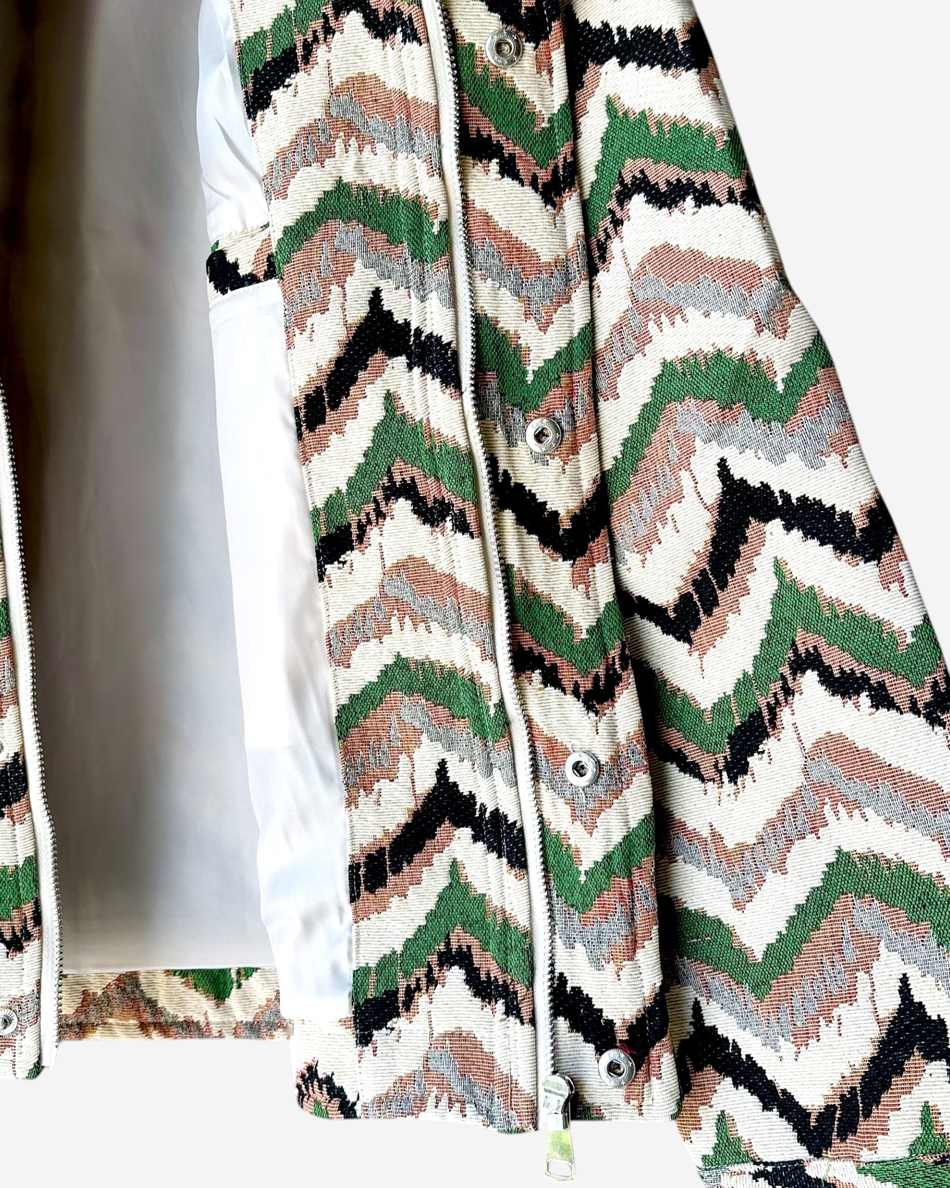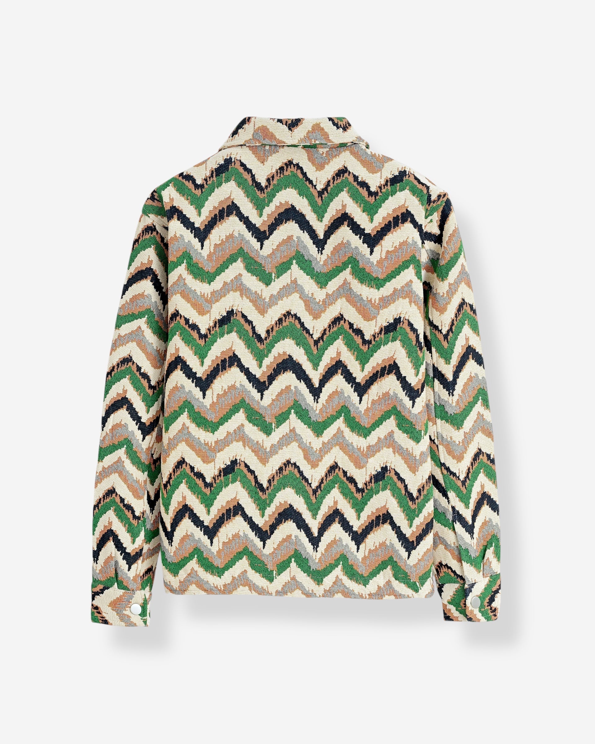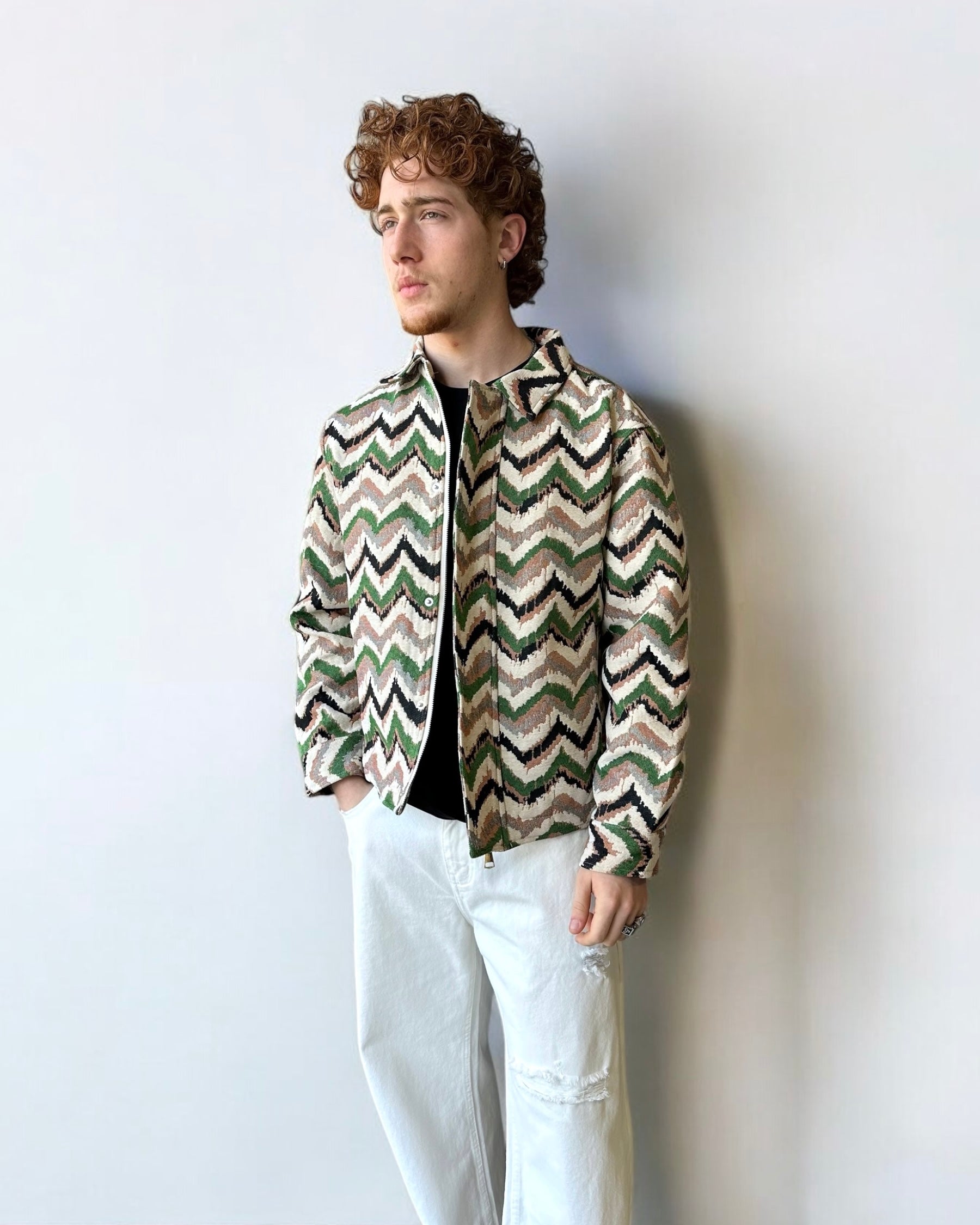 Un mix perfetto tra originalità e stile. Questa giacca conquista con il suo pattern zigzag multicolor nei toni del verde, beige e nero, ideale per aggiungere carattere a qualsiasi outfit.