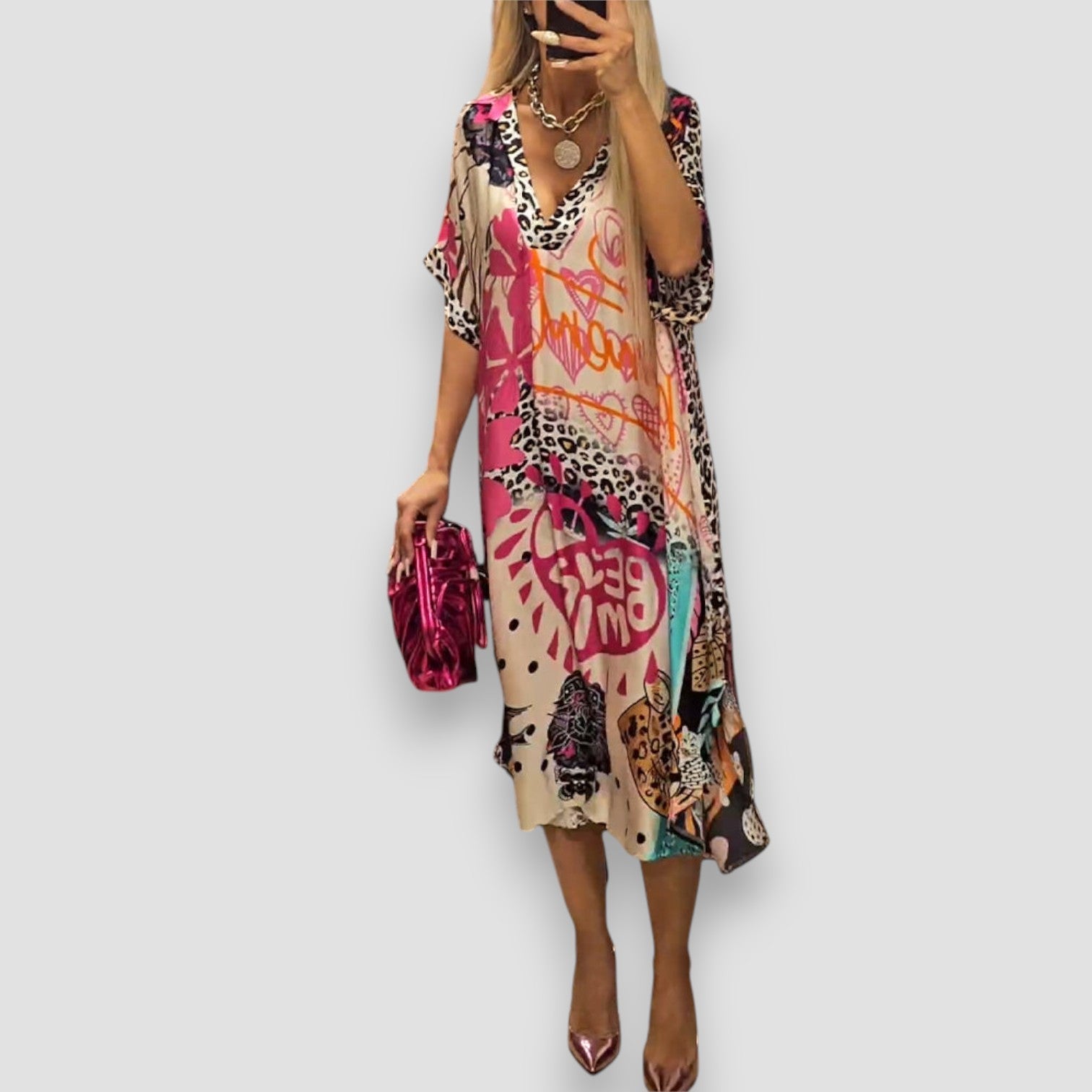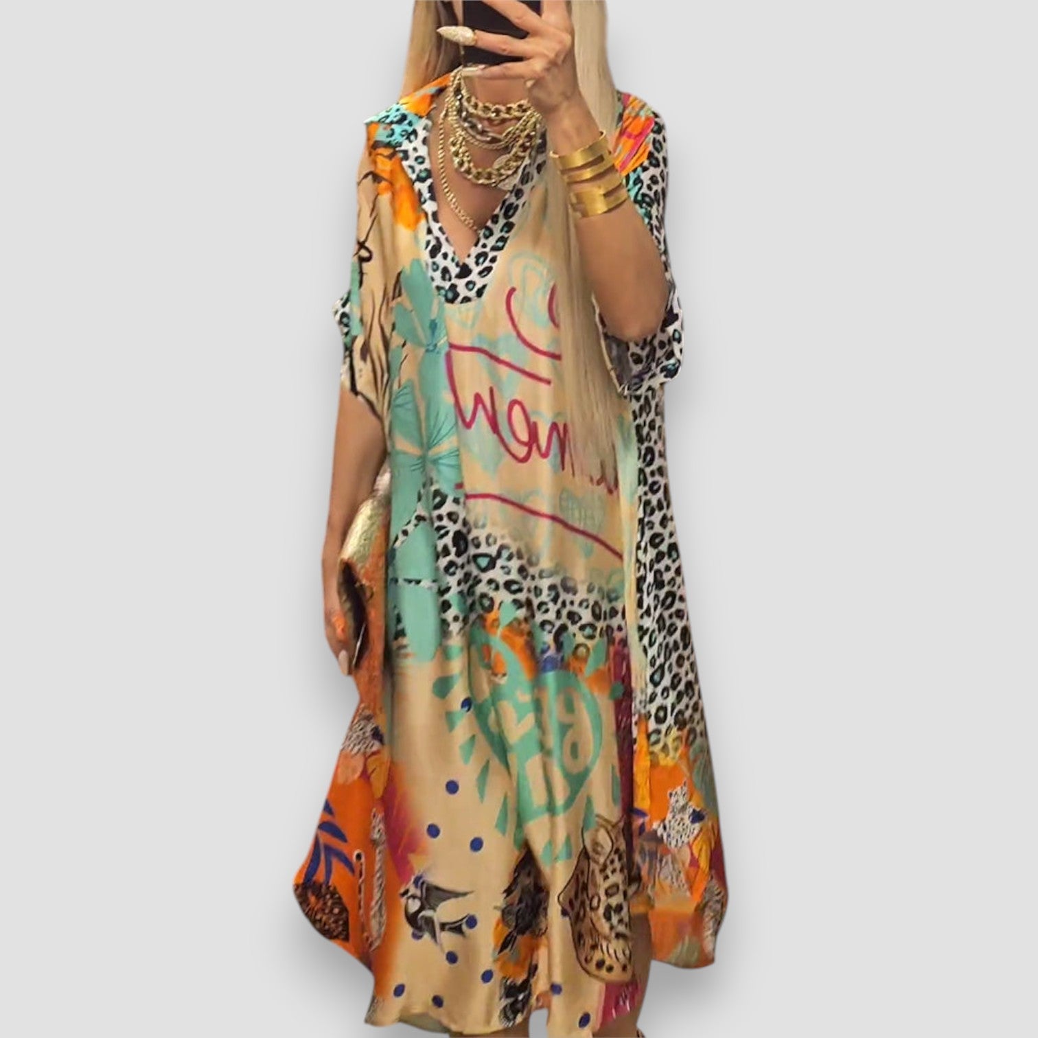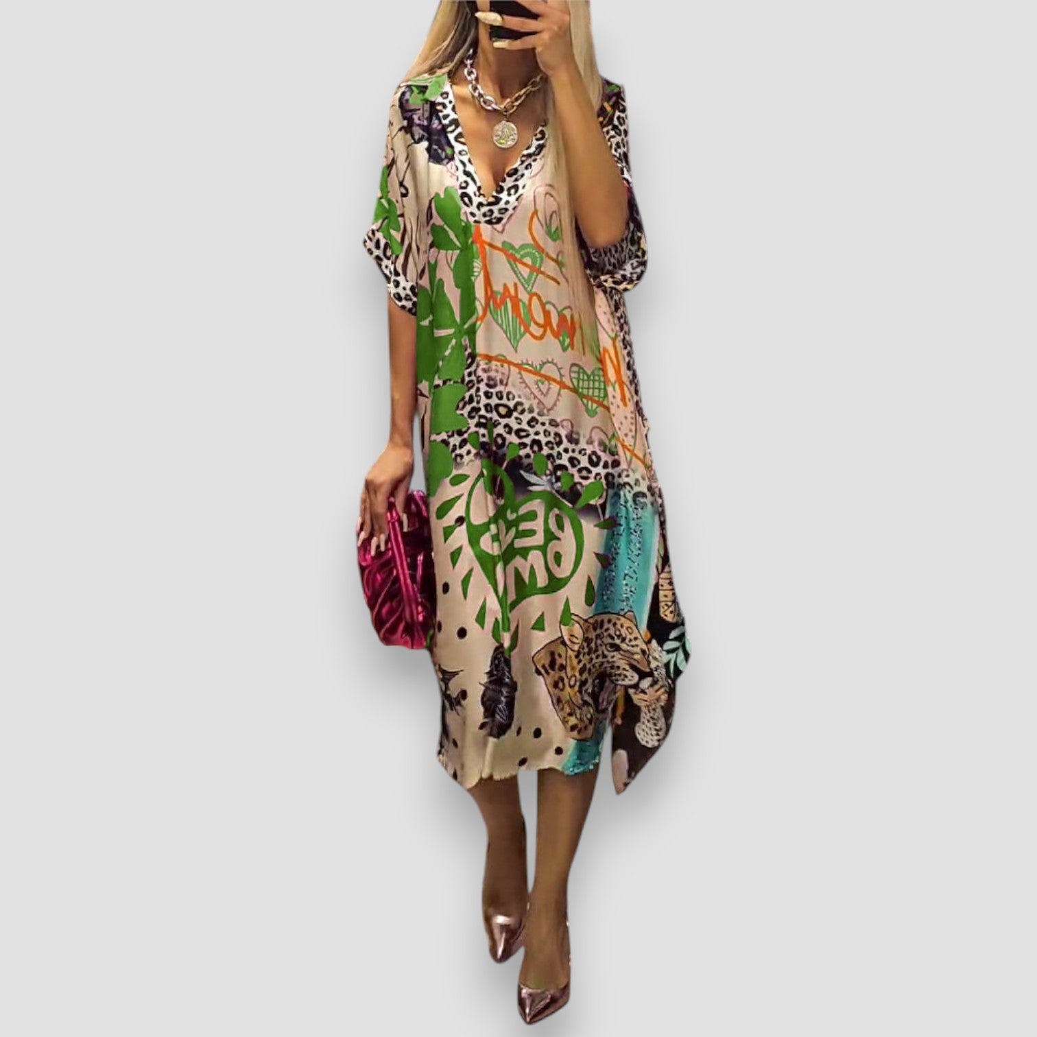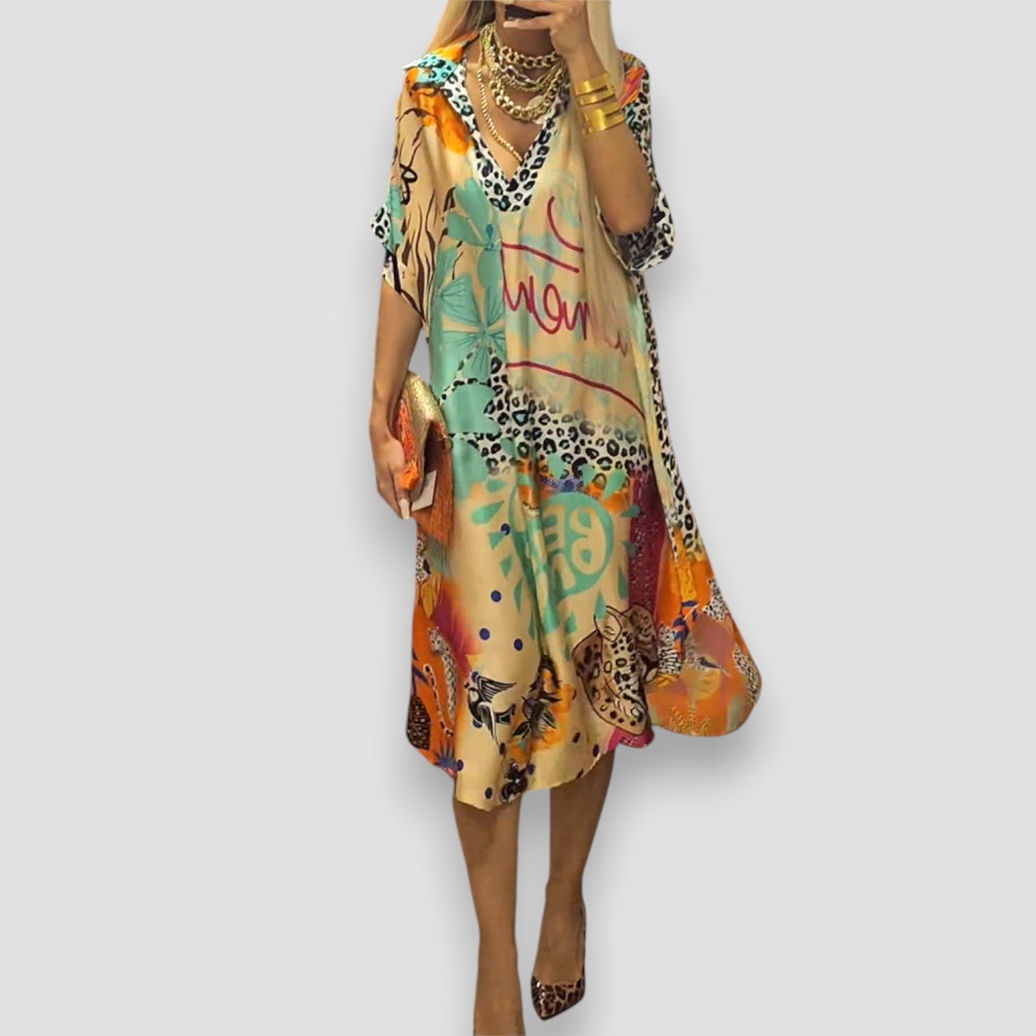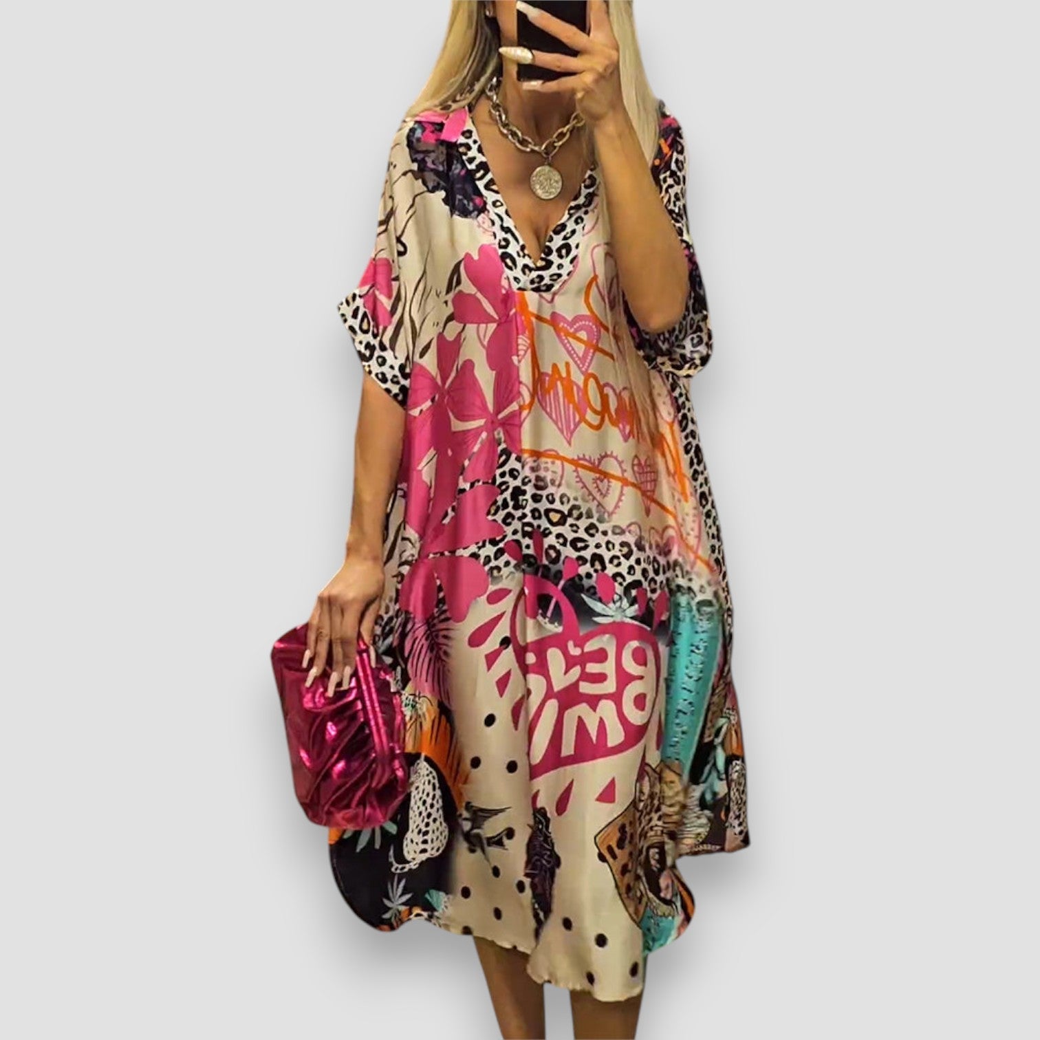 Leggero, elegante e perfetto per le giornate di sole – l'abito estivo Gianna è un must-have per un look fresco e senza sforzo. Con una scollatura a V e una vestibilità ampia, questo abito offre massimo comfort ed eleganza per ogni occasione.