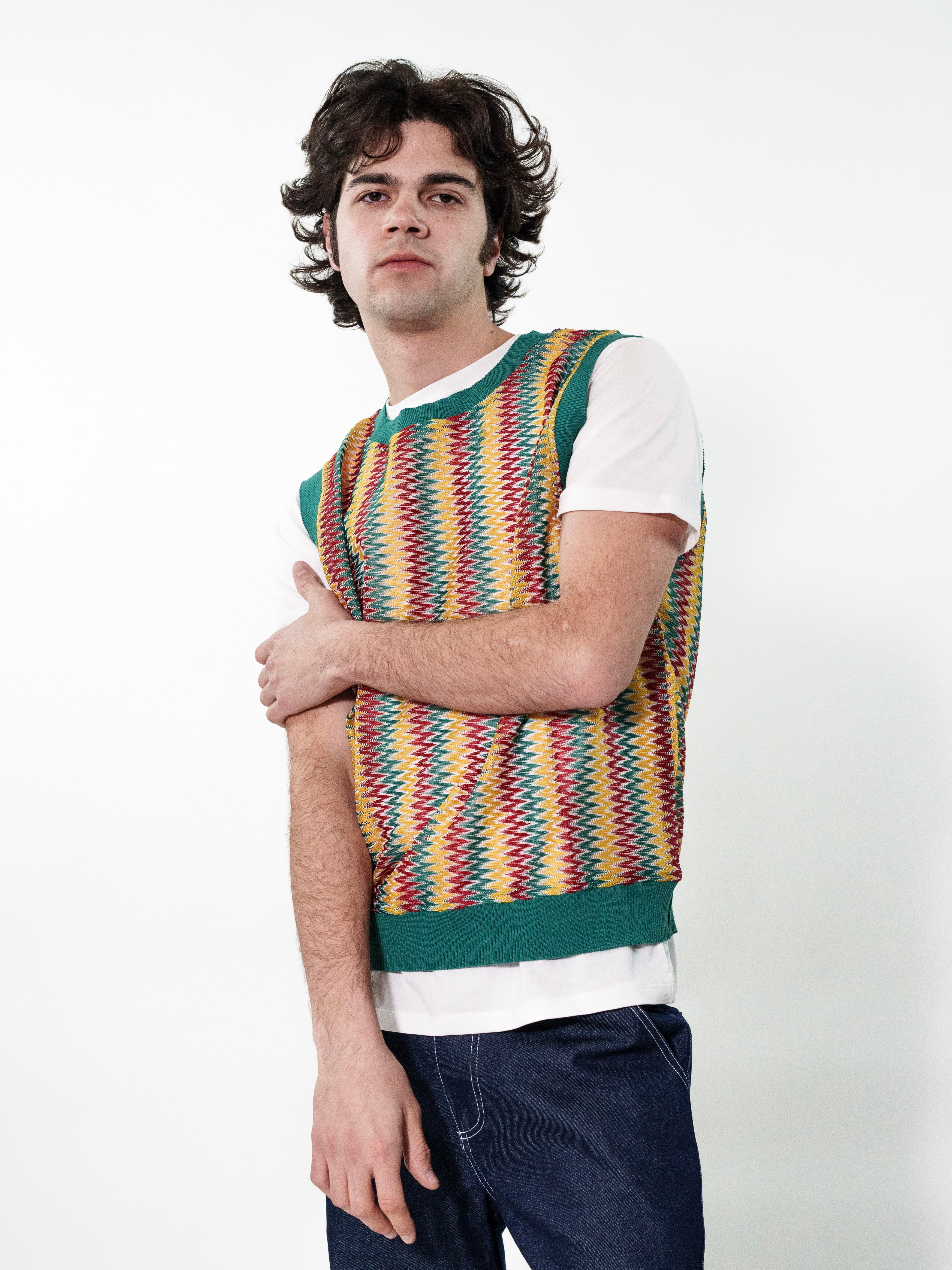 Gilet in maglia multicolor con vestibilità comoda. Il pattern vibrante e i dettagli a costine lo rendono un capo versatile, perfetto da sovrapporre a t-shirt o camicie per un look casual e originale.