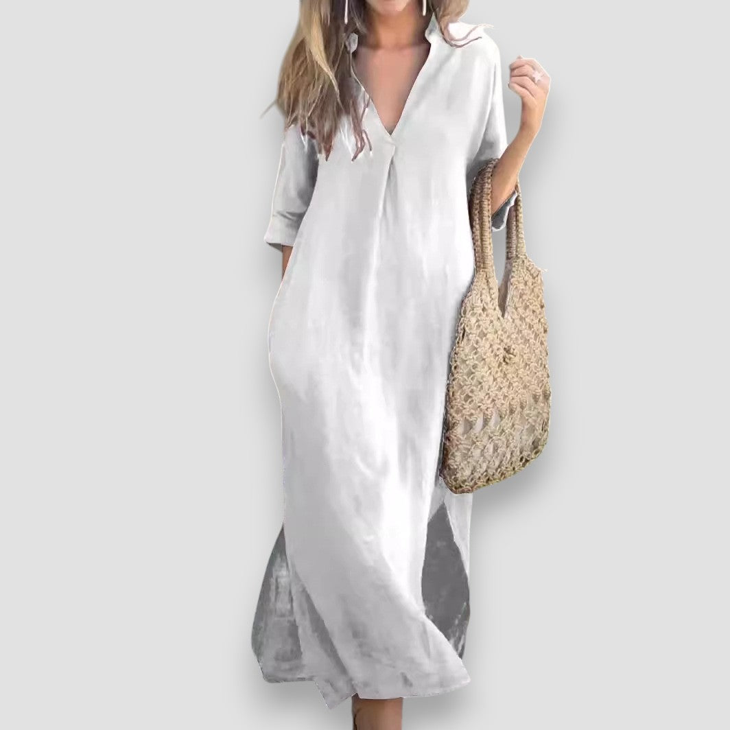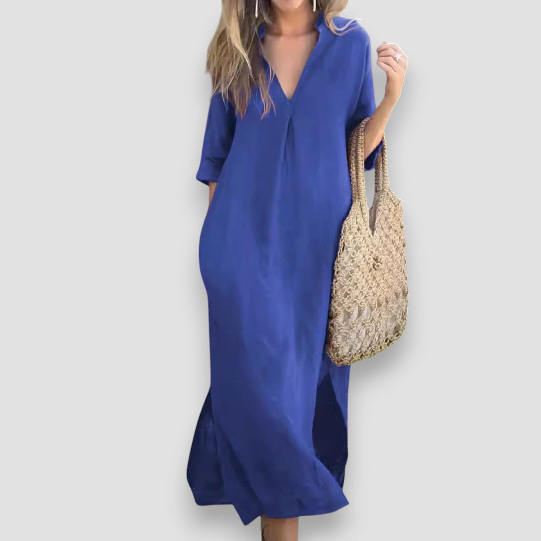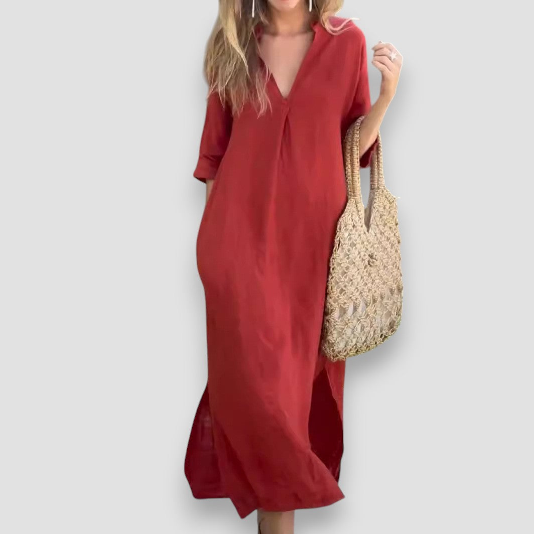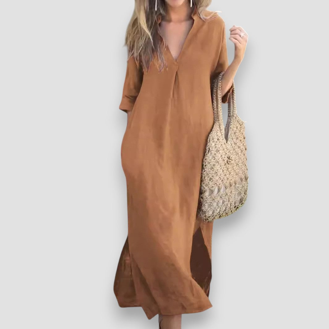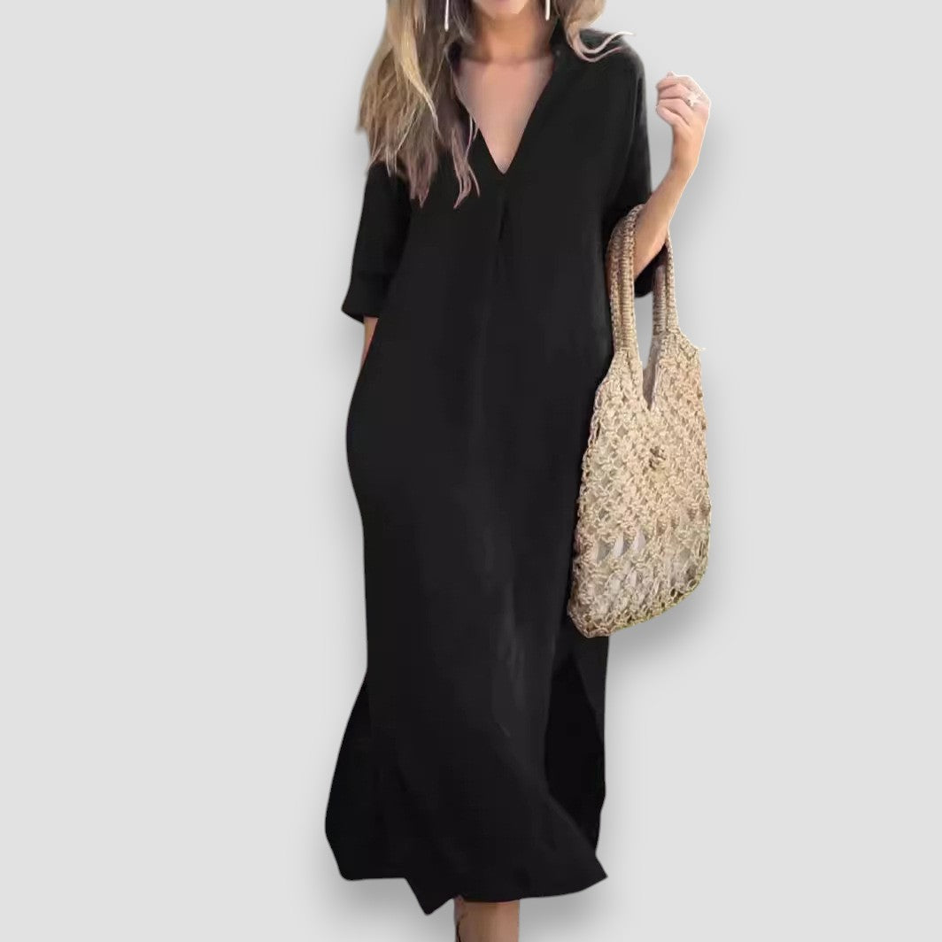 L’abito Gioia unisce stile e praticità in un design raffinato. Lo scollo a V e la vestibilità morbida lo rendono perfetto per ogni occasione, mentre le tasche laterali aggiungono un tocco funzionale e casual.