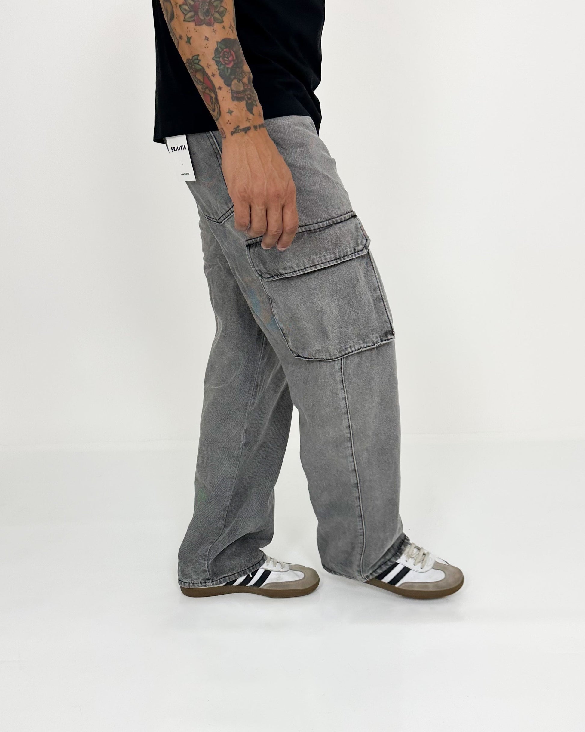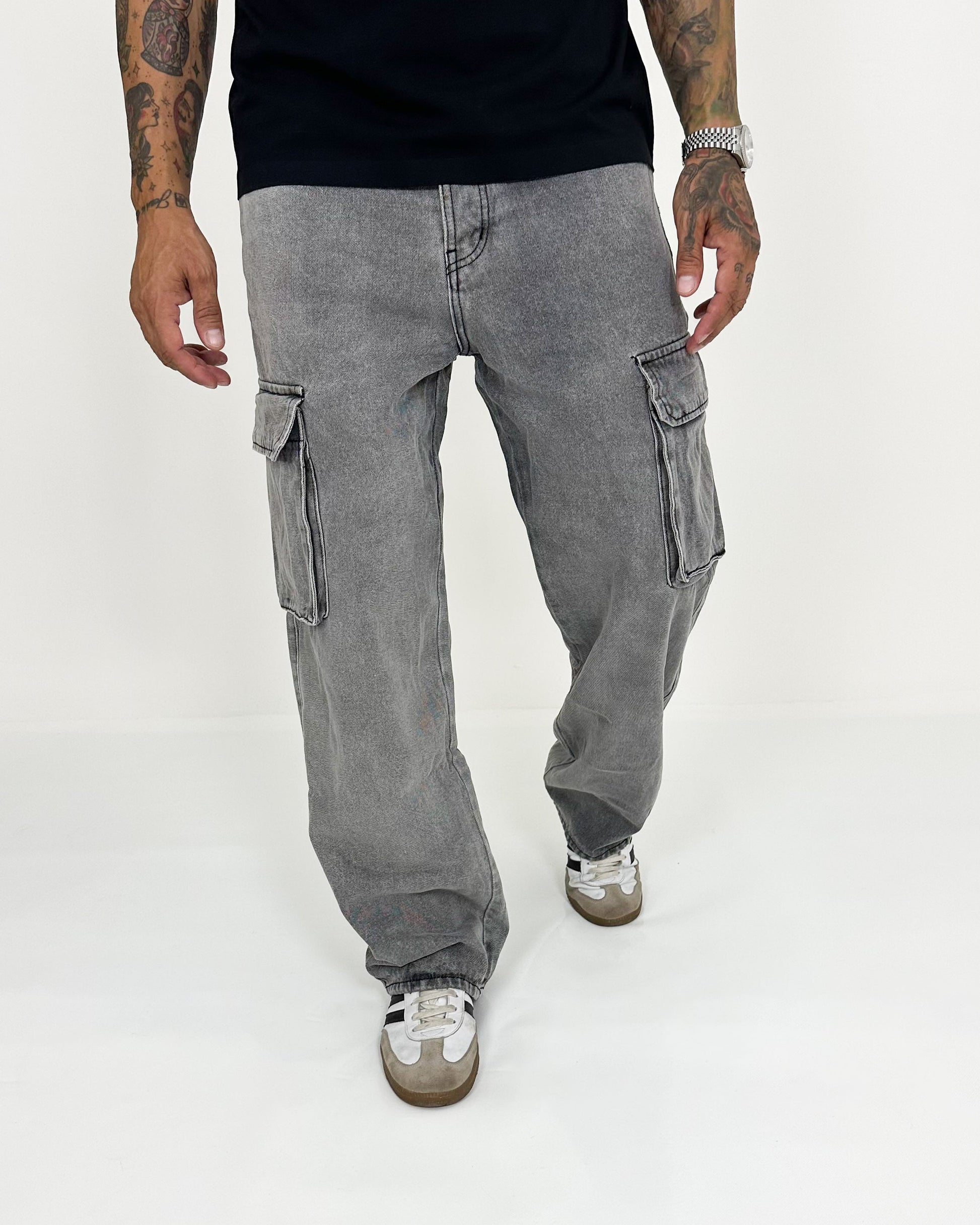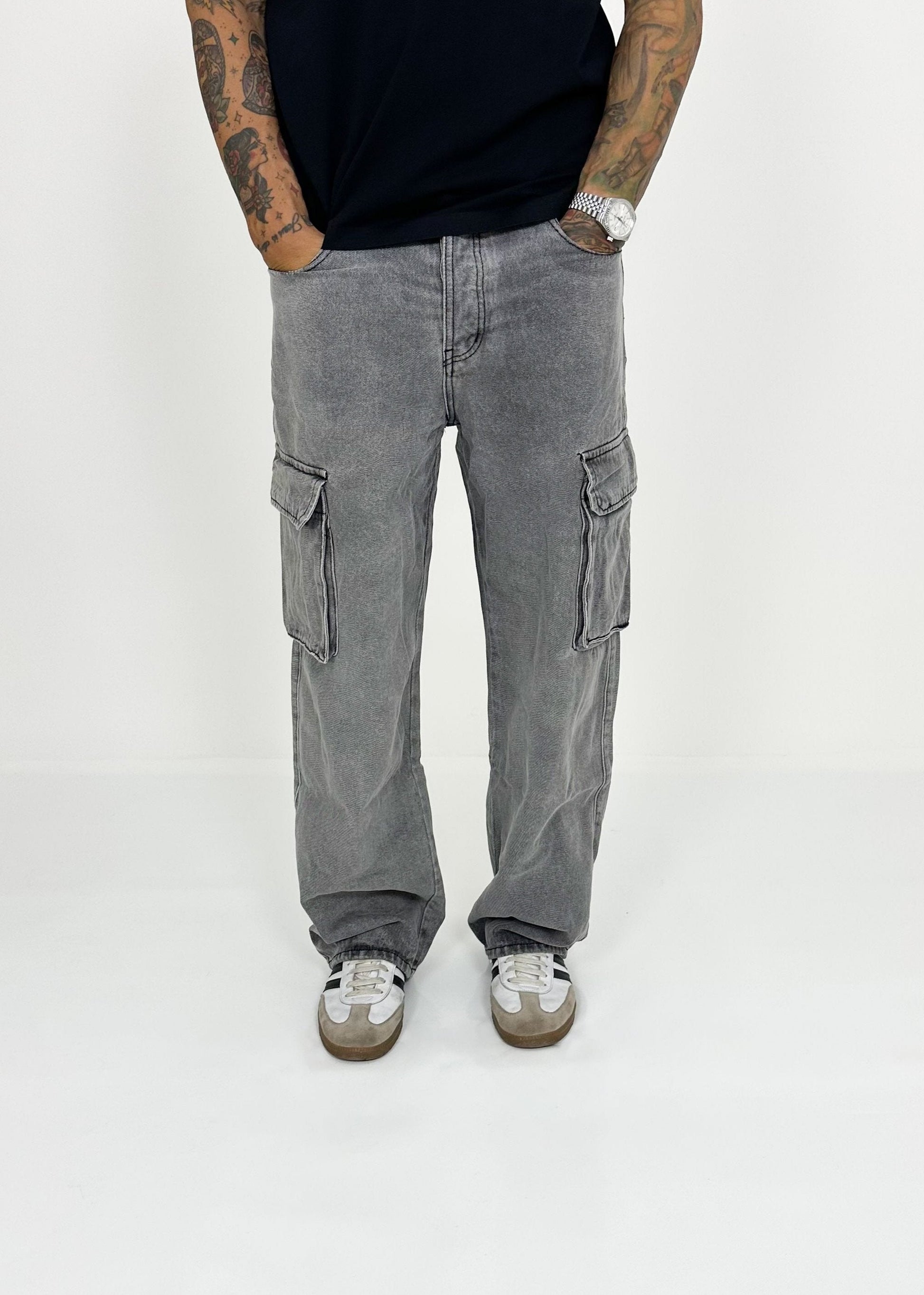 Jeans cargo relaxed fit con tasche posteriori e applicazione di tasche applicate con patta, chiusura frontale con cerniera e bottone. Effetto slavato grigio scuro.
