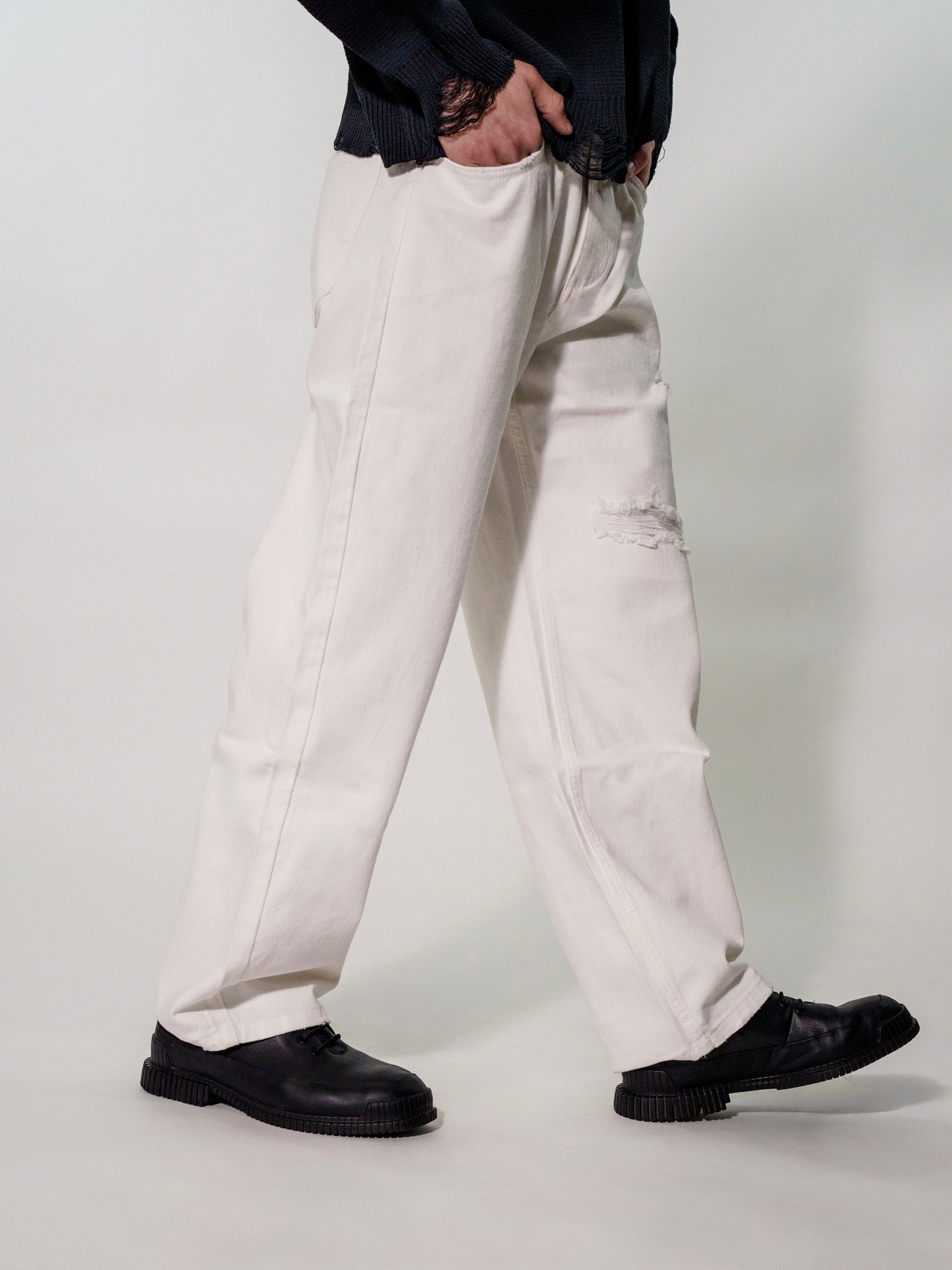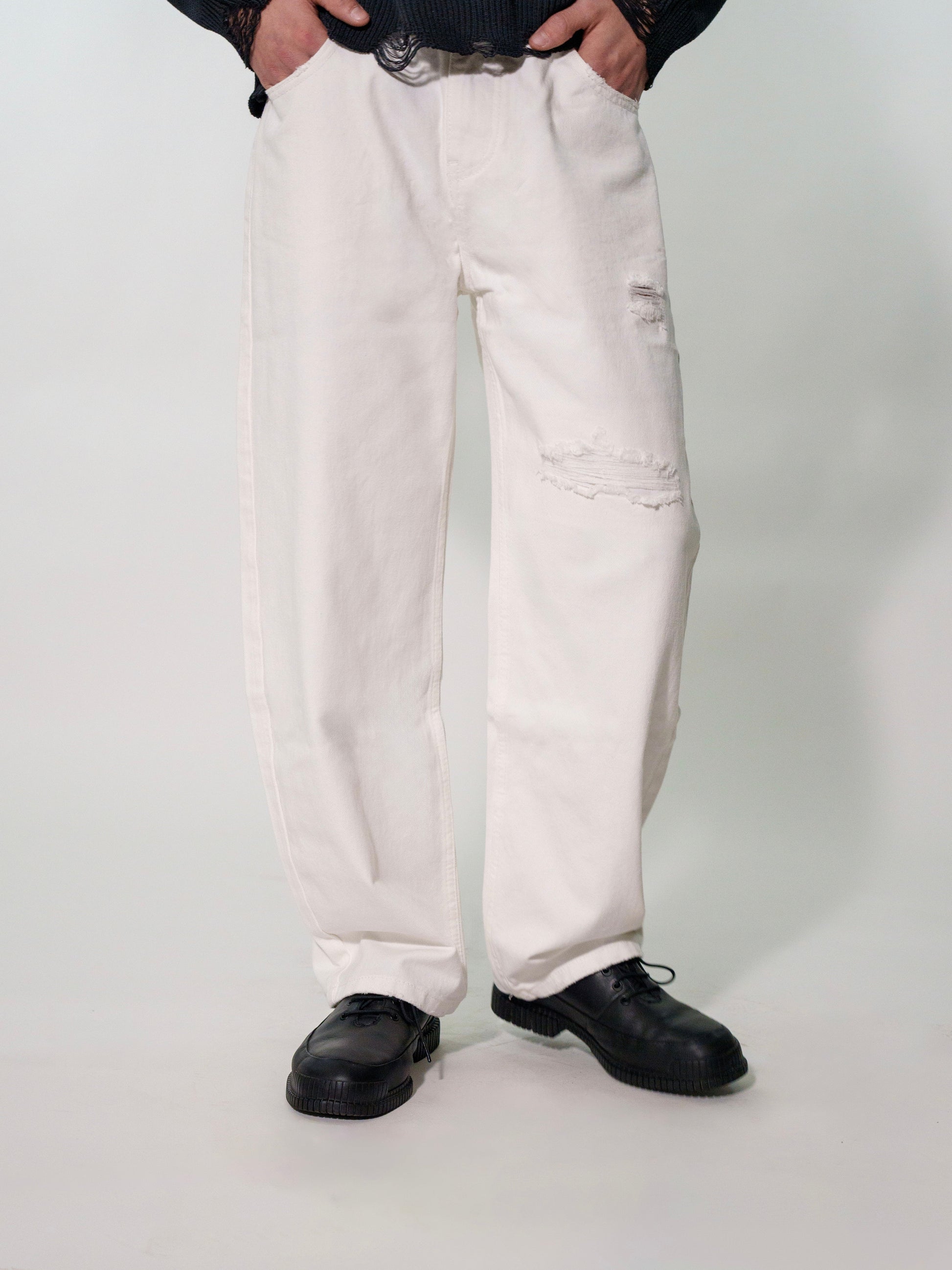 Un must-have dal carattere deciso: questo pantalone in denim bianco si distingue per la vestibilità a gamba larga, che unisce comfort e tendenza. Il design minimal con un tocco di raw edge e dettagli distressed lo rende perfetto per look casual e streetwear. Versatile e contemporaneo, si abbina facilmente a sneakers o mocassini per uno stile impeccabile in ogni occasione.