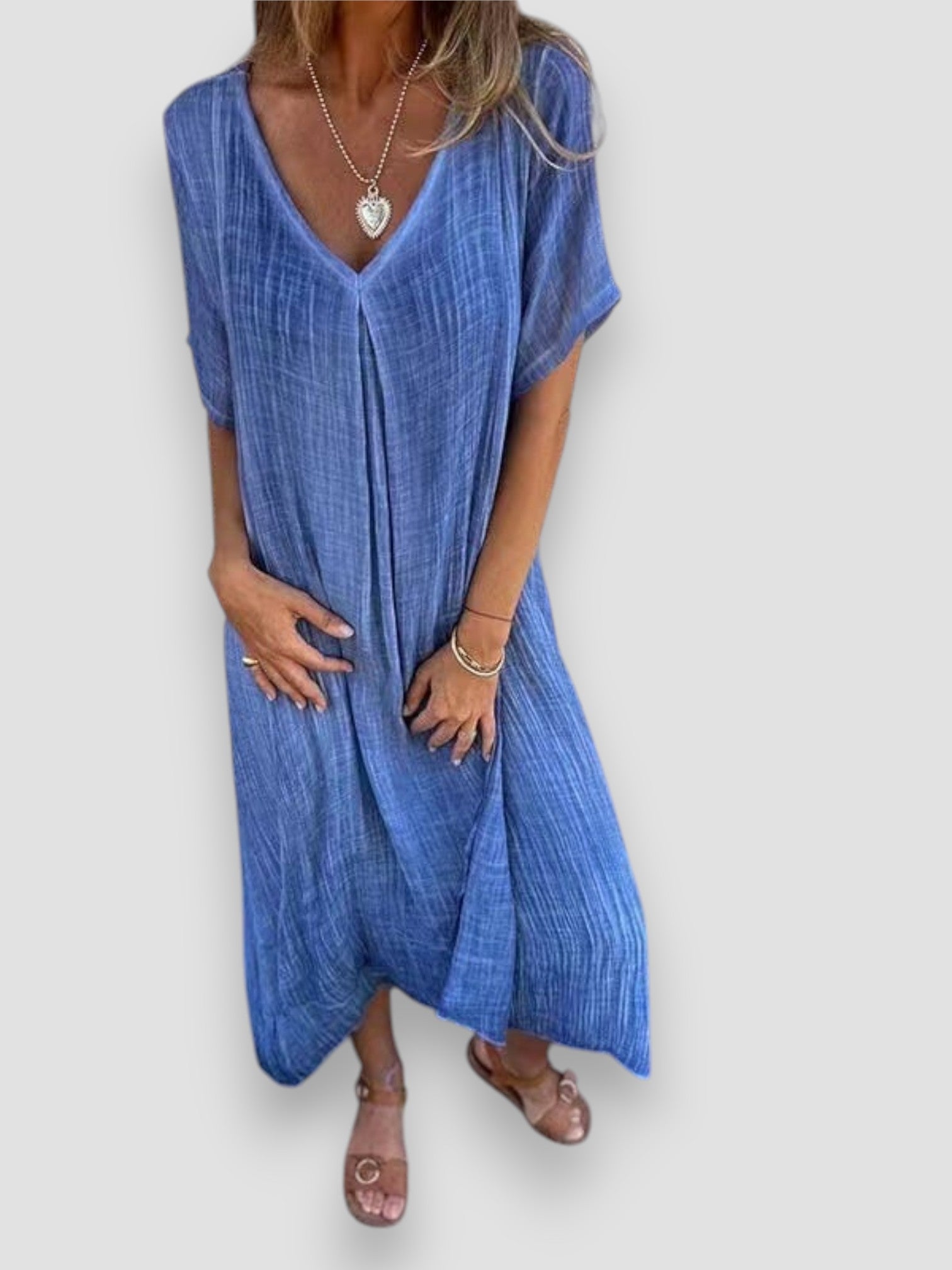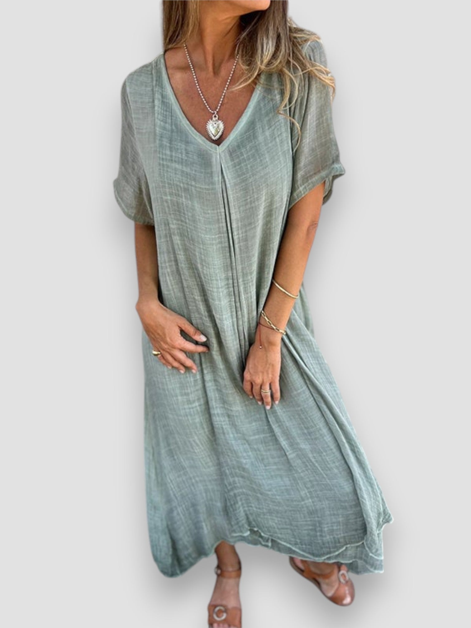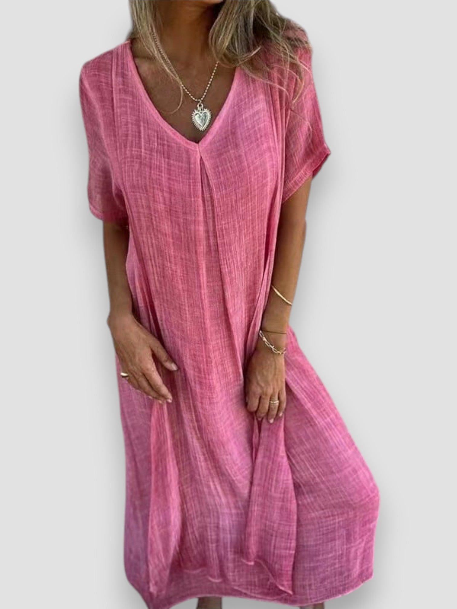 L'abito midi Moira unisce stile senza sforzo e massimo comfort. Lo scollo a V valorizza la silhouette, mentre il design senza tempo lo rende perfetto per ogni occasione. Ideale per le giornate estive e i momenti eleganti.