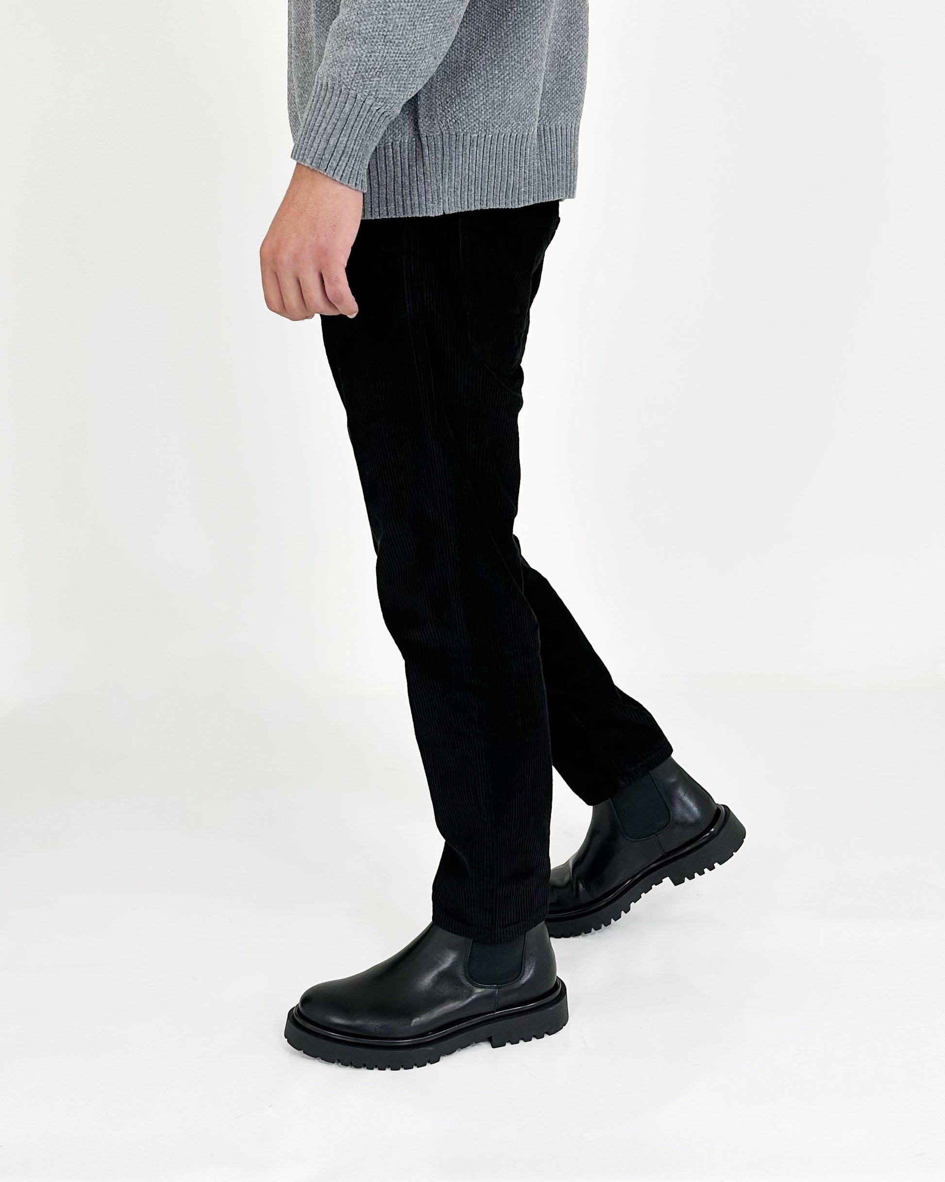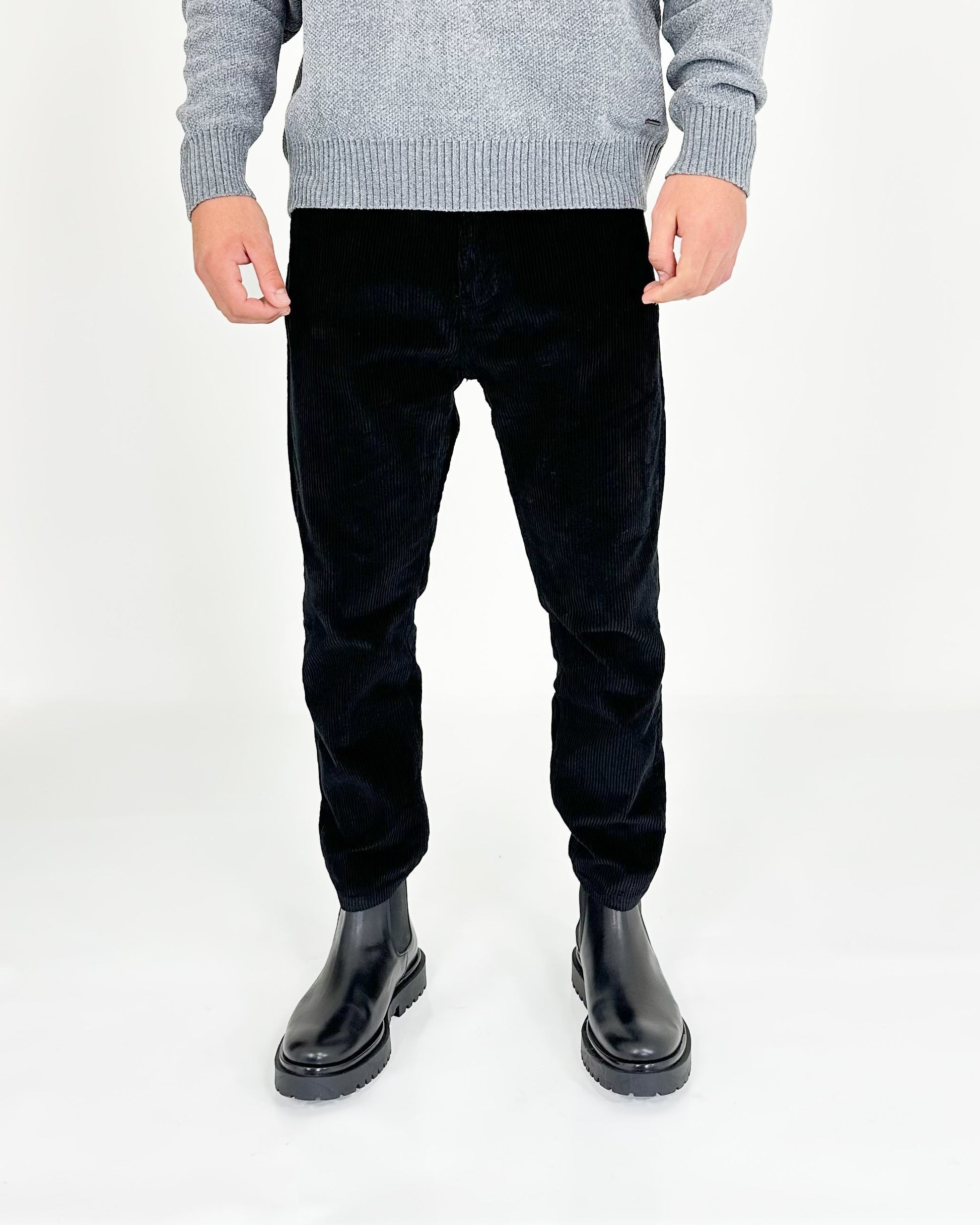 Pantalone regular fit in velluto a coste, tasche frontali e posteriori, chiusura frontale con cerniera e bottone.