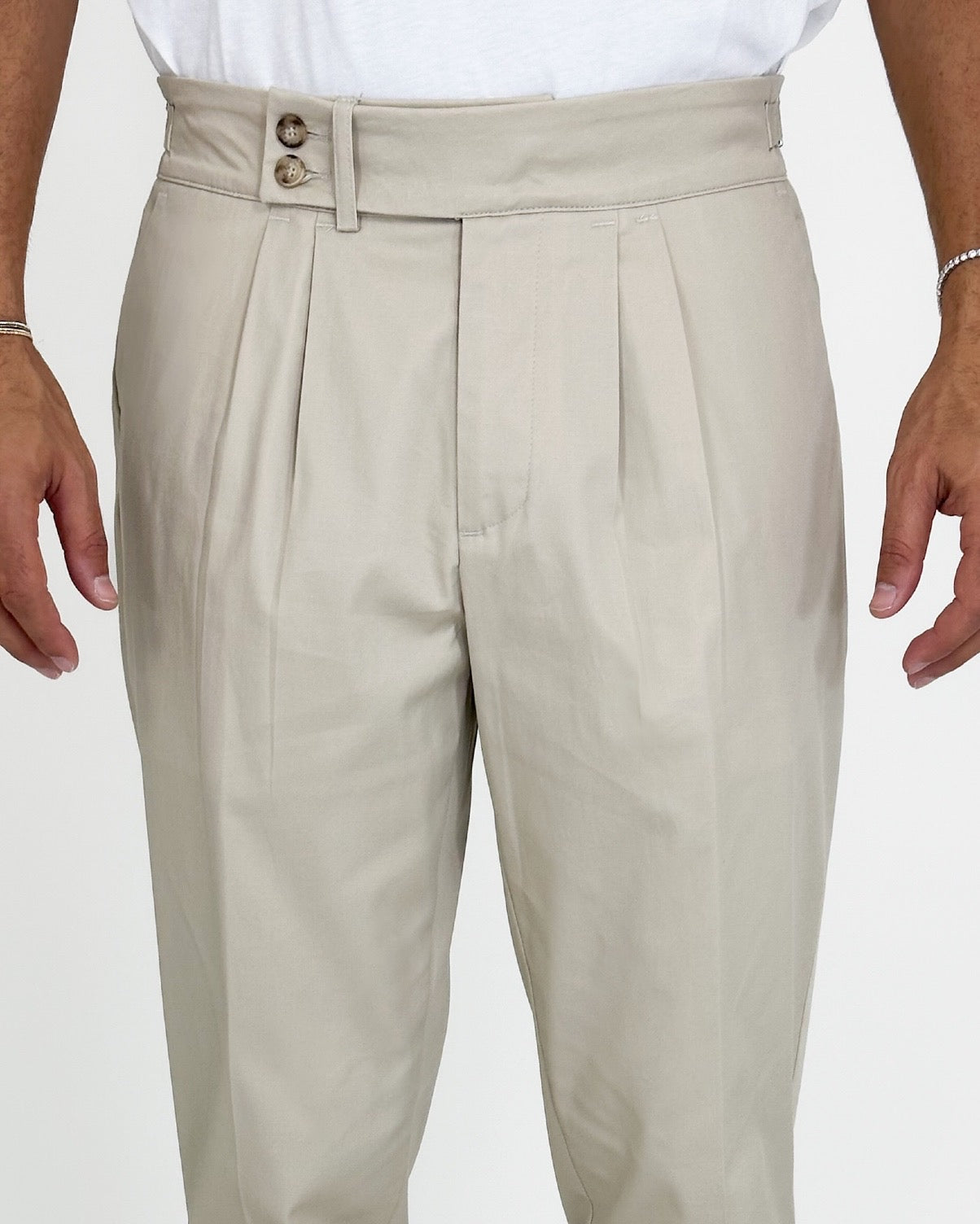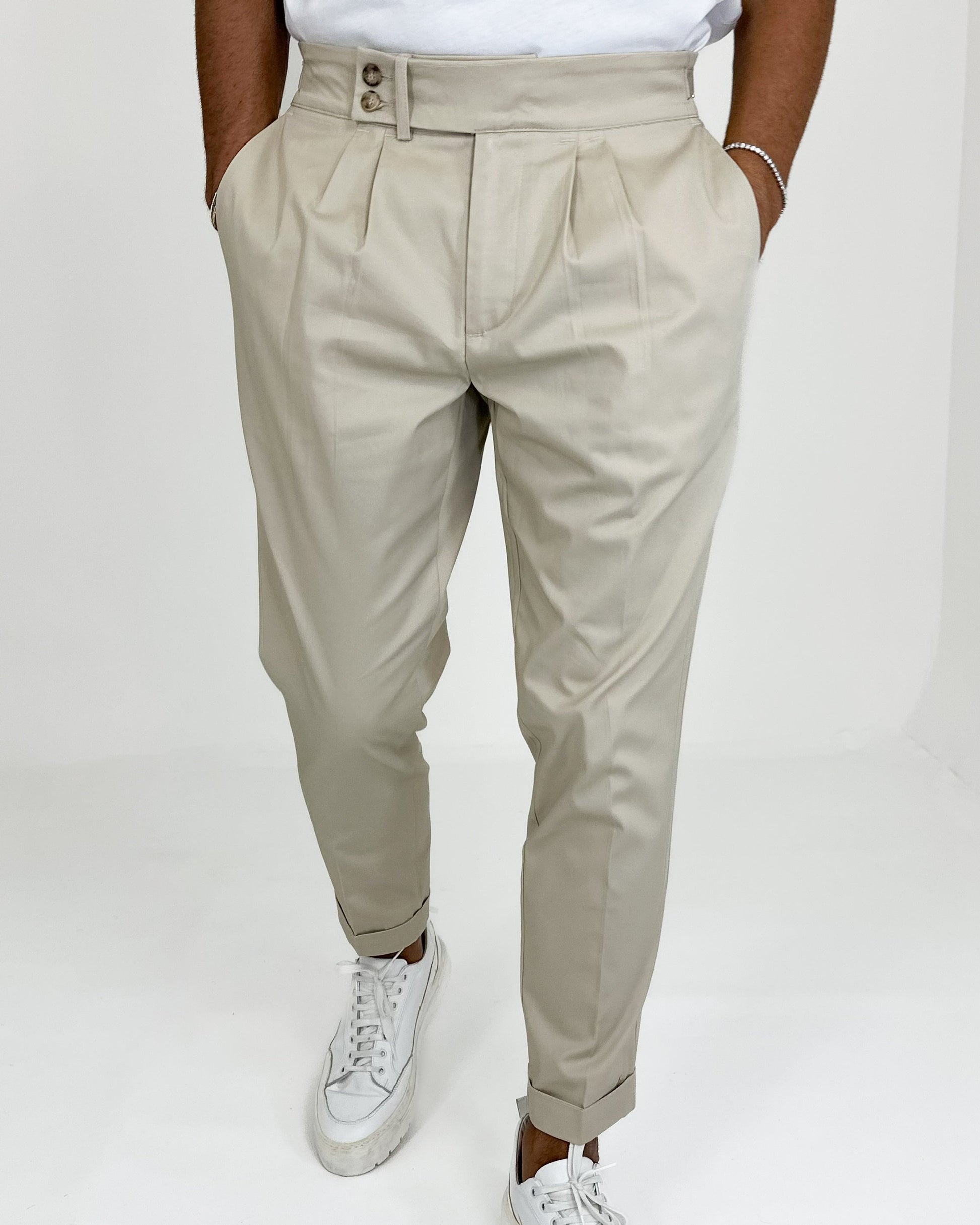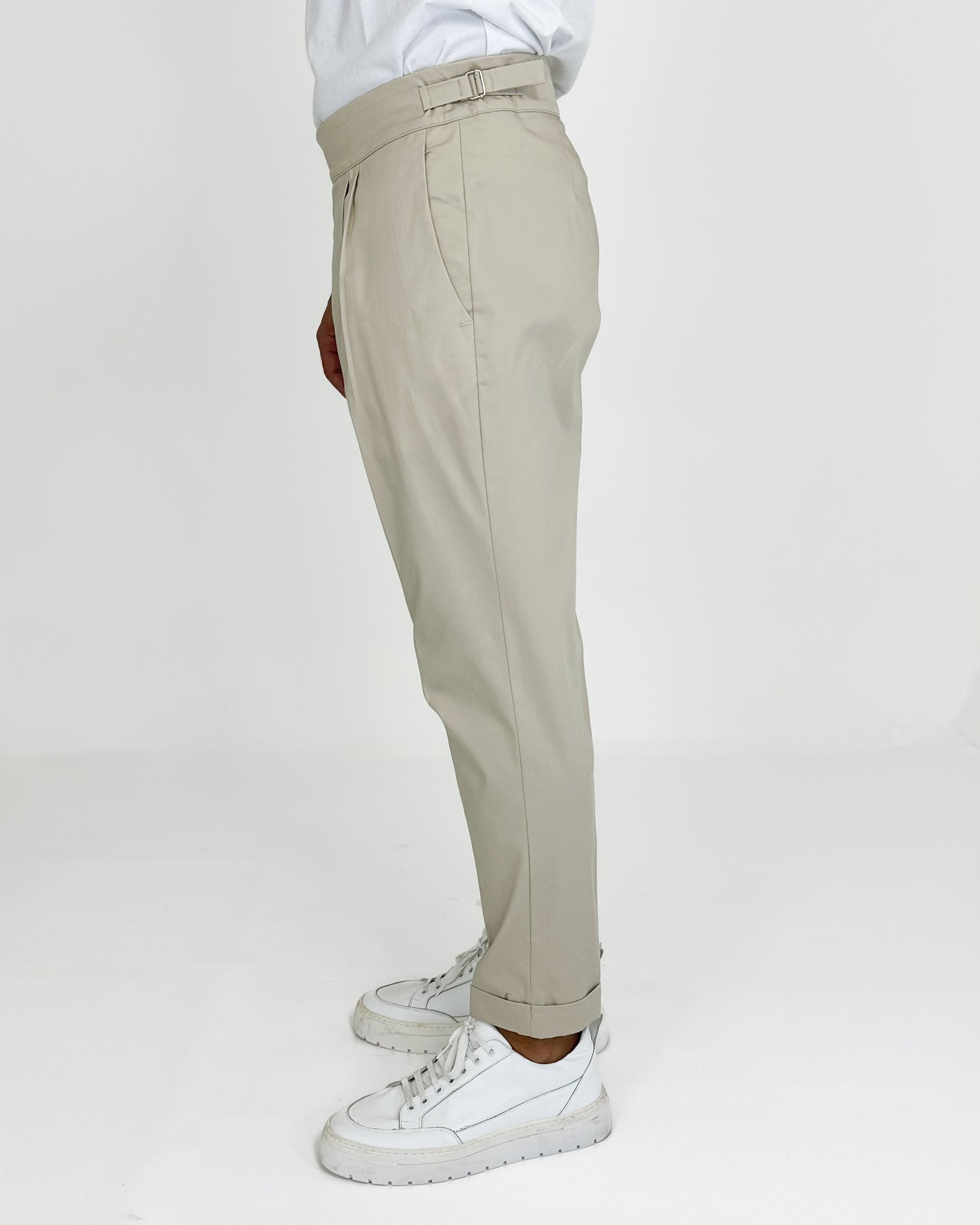 Pantalone regular fit ad alta vita, pence e abbottonatura decentrata con cerniera e bottoni, risvolto con possibilità di allungarlo. Tessuto leggero, cotone 97% ea 3%