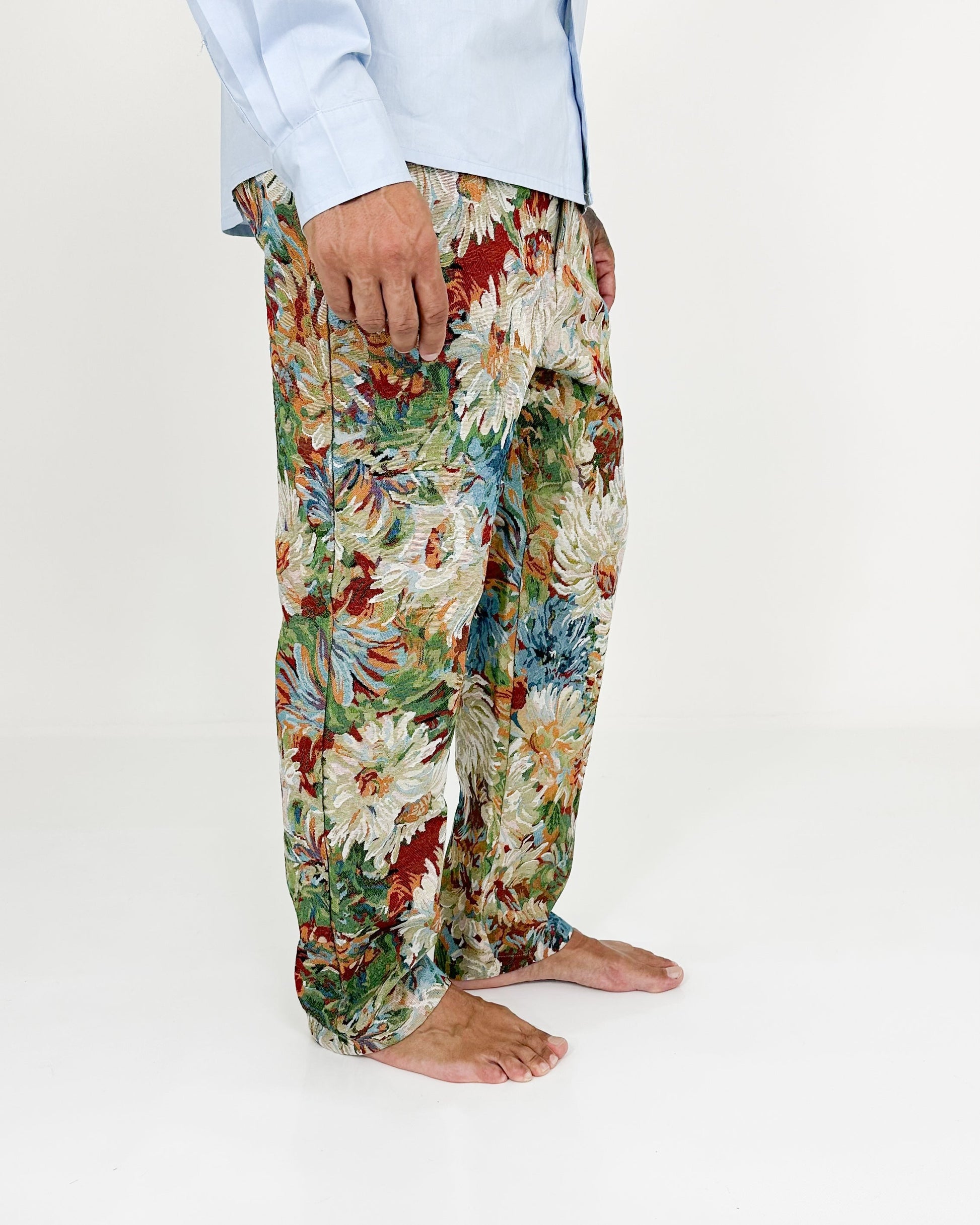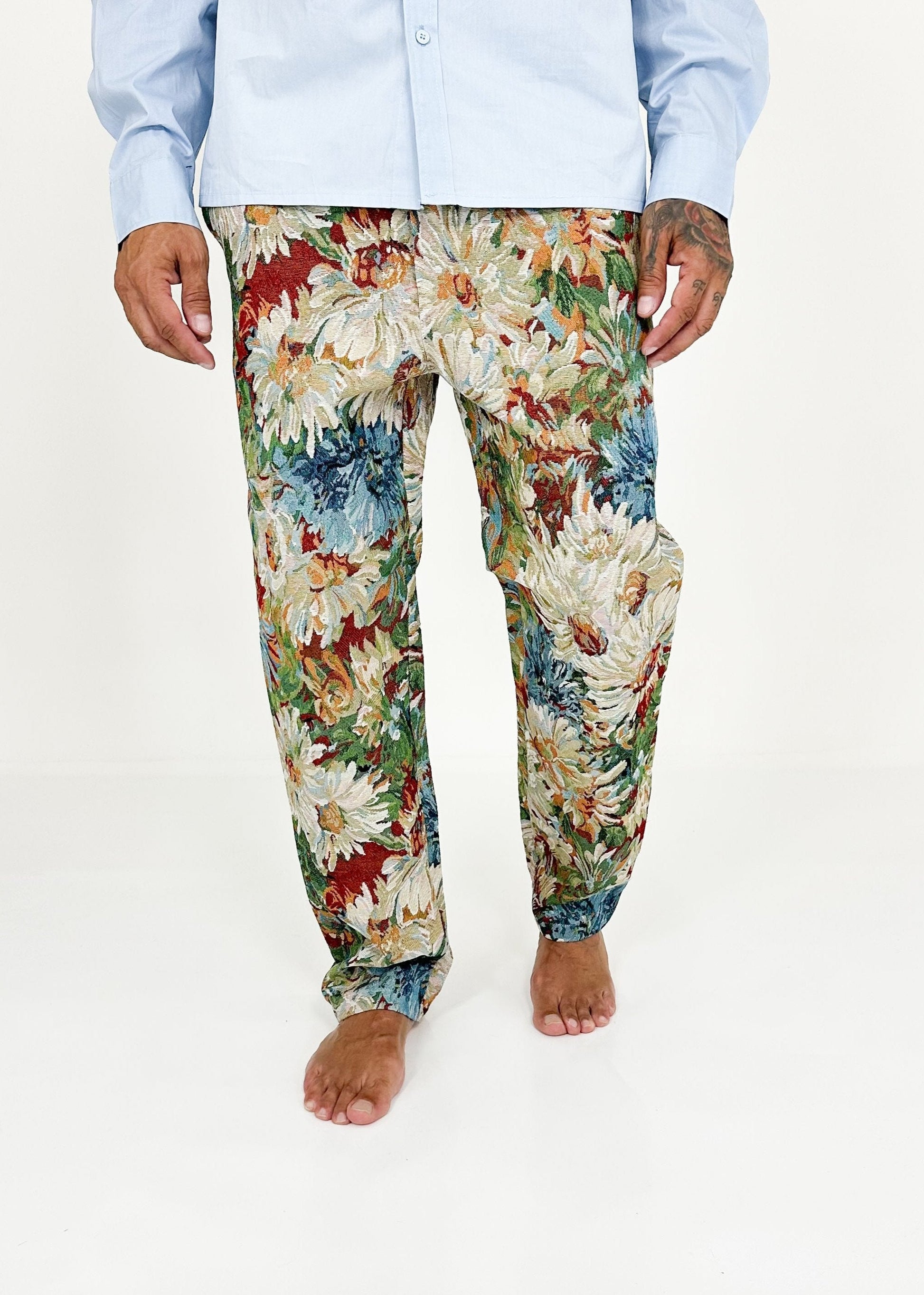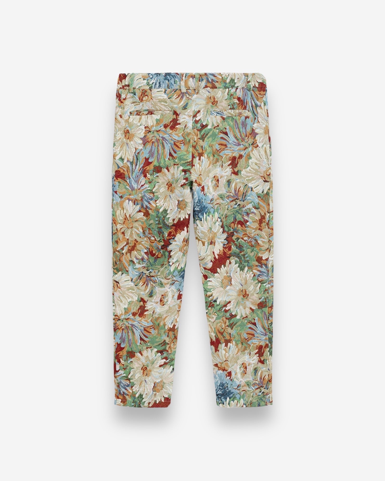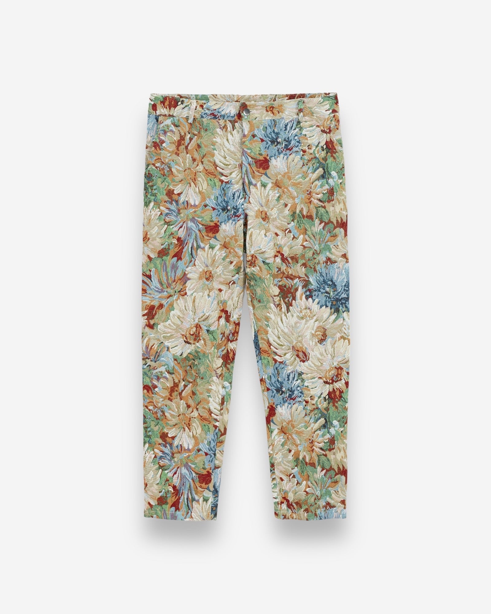 Pantaloni effetto jacquard floreale, tasche posteriori a filetto e chiusura con bottone e zip. Vestibilità relaxed fit, vita morbida.
