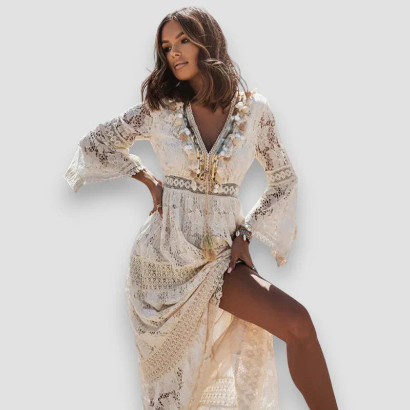 Questo abito da spiaggia offre uno stile leggero e confortevole. Il design arioso e i dettagli sottili aggiungono un tocco raffinato, rendendolo ideale per ogni occasione, da una giornata al sole in spiaggia a una passeggiata serale rilassante.